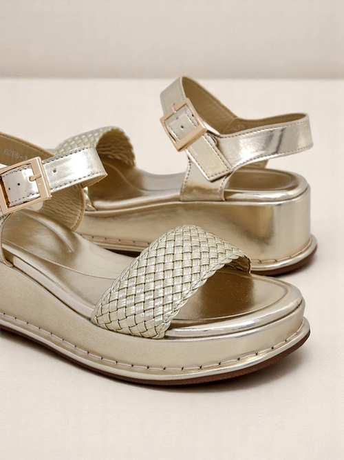 Sandále Aura sú kвінтесенciou letnej elegancie. Vyrobené z vysoko kvalitnej ekologickej kože, očaria zlatou farbou, ktorá dodá lesk každému outfitu. Jemne pletený pásik na prednej strane im dodáva jedinečný charakter a stabilný podpätník zaisťuje pohodlie pri nosení počas celého dňa.