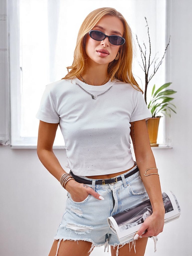 - Dámske bavlnené tričko s riasením na bokoch, retiazkovým detailom a trblietkami, ktoré spája pohodlie s jemným leskom. Ideálne na voľnočasové outfity, dodáva každému vzhľadu jedinečný šarm.