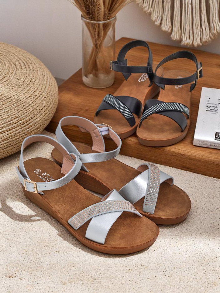 Sandále Minerva sú výnimočné sandále na platforme, ktoré spájajú eleganciu s komfortom. Zvršok je vyrobený z vysoko kvalitnej ekokože s hodvábnym povrchom, čo zaručuje nielen štýlový vzhľad, ale aj trvácnosť na mnoho sezón. Krížový remienok je zdobený drobnými, trblietavými kryštálikmi, ktoré jemne odrážajú svetlo a zdôrazňujú moderný charakter modelu. Vnútorná časť topánky a stielka sú vyrobené z mäkkého syntetického materiálu s antibakteriálnymi vlastnosťami, čo zaisťuje nohám komfort a sviežosť aj počas najteplejších dní. Platforma z penového materiálu EVA zaisťuje ľahkosť obuvi a stabilitu pri každom kroku, chráni kĺby a zaručuje pohodlie pri dlhodobom používaní. Podrážka s protišmykovým dezénom zvyšuje bezpečnosť na rôznych povrchoch. Nastaviteľné zapínanie s kovovou sponou umožňuje perfektné prispôsobenie sandálov k nohe. Sandále Minerva sú vynikajúcou voľbou na každý deň, ale aj na špeciálne príležitosti. Ich nadčasový dizajn umožňuje ľahké kombinovanie s rôznymi štýlmi: 1. V ležérnom štýle – s ľahkými ľanovými nohavicami a jednoduchým topom, čím vytvoríte pohodlný outfit na nákupy alebo prechádzku. 2. Na stretnutie s priateľmi – v kombinácii s vzdušnou midi sukňou a jemnou bižutériou. 3. Do práce – sandále sa skvele hodia k materiálnym nohaviciam 7/8 a bielej košeli, čím vznikne pohodlný, ale elegantný vzhľad. Aby sandále dlho udržali svoj lesk, odporúča sa čistiť zvršok vlhkou handričkou a vyhnúť sa kontaktu s vodou a čistiacimi prostriedkami. Skladujte na suchom a vetranom mieste, najlepšie v originálnej krabici. Tento typ obuvi zapadá do súčasných trendov minimalistickej elegancie a mestského šiku – perfektne sa hodí do šatníka každej ženy, ktorá si cení pohodlie a nadčasový dizajn.