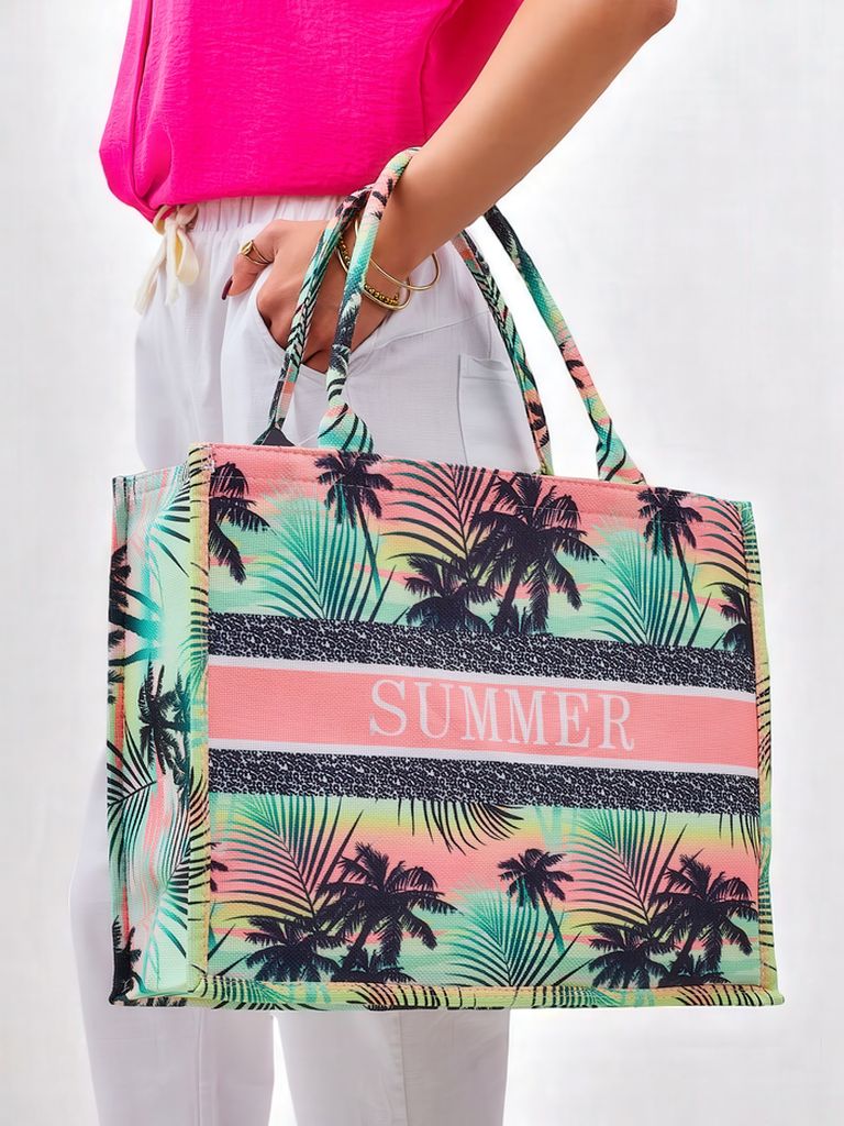 - Veľká dámska plátená taška s farebným motívom a nápisom "SUMMER". 1 priehradka, ľahká a priestranná – ideálna na pláž, dovolenku a letné outfity!