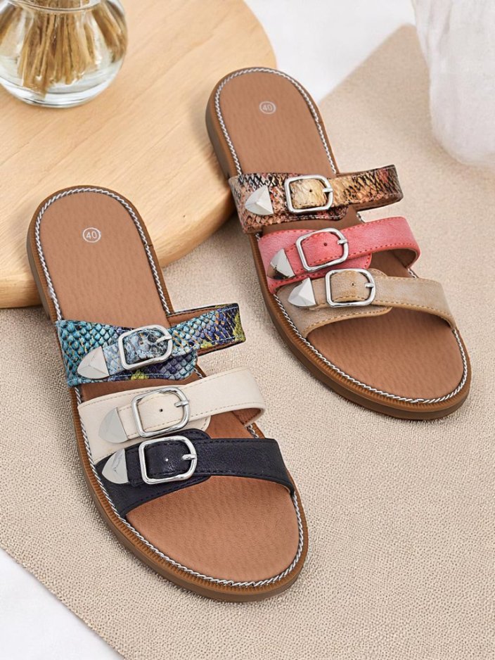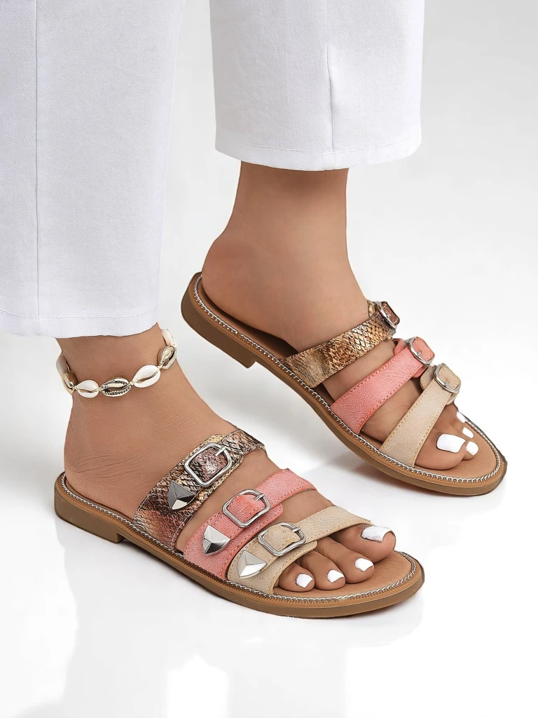 - Ploščati natikači iz eko usnja z reliefnim vzorcem in okrasnimi zaponkami. Stilski, udobni – idealni za poletje, mesto in vsakodnevne stajlinge!
