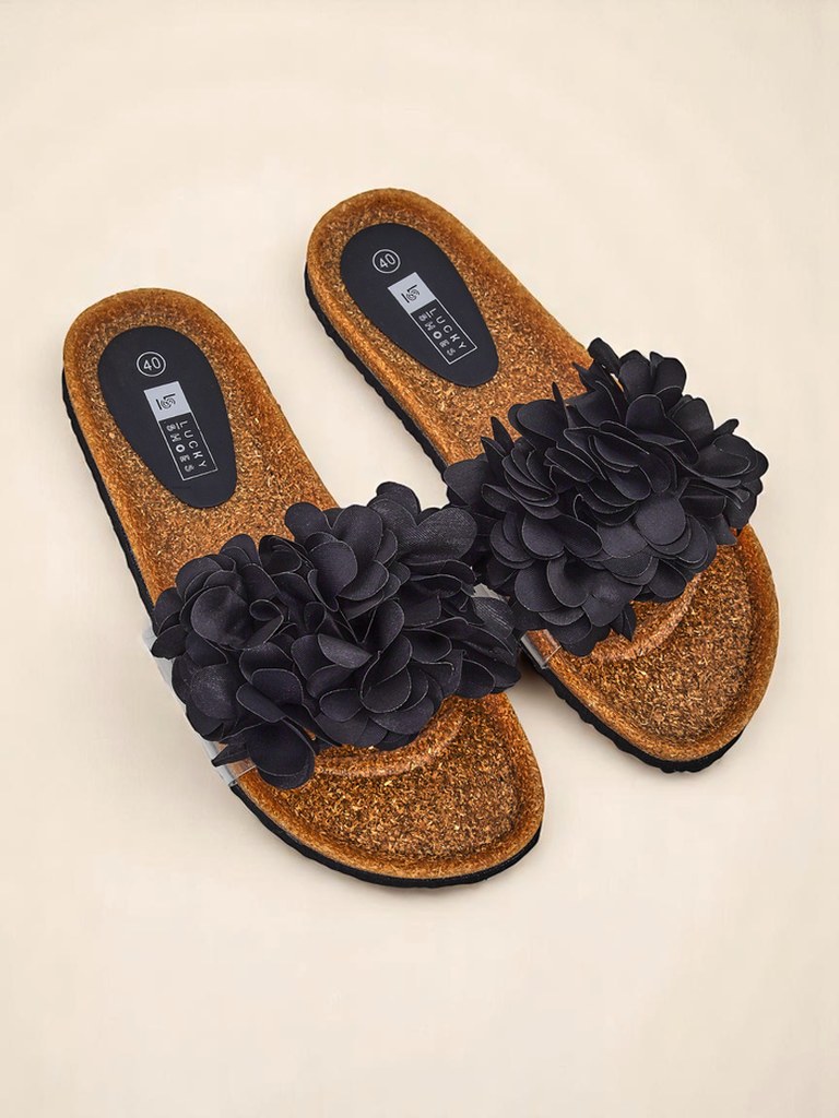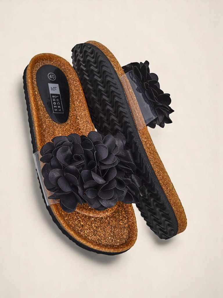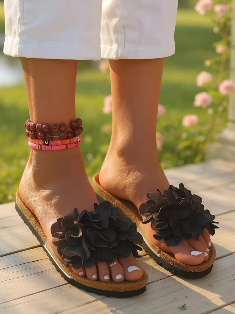 - Čudoviti natikači z ravnim gumijastim podplatom in okrasnimi cvetlicami na paščku. Idealni za poletje – lahki, udobni in ženstveni. Dajo čar vsakemu stilu.