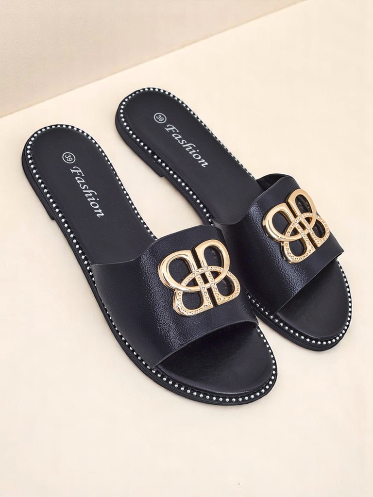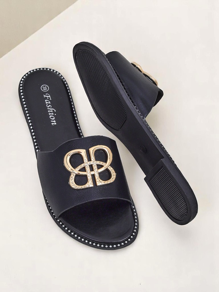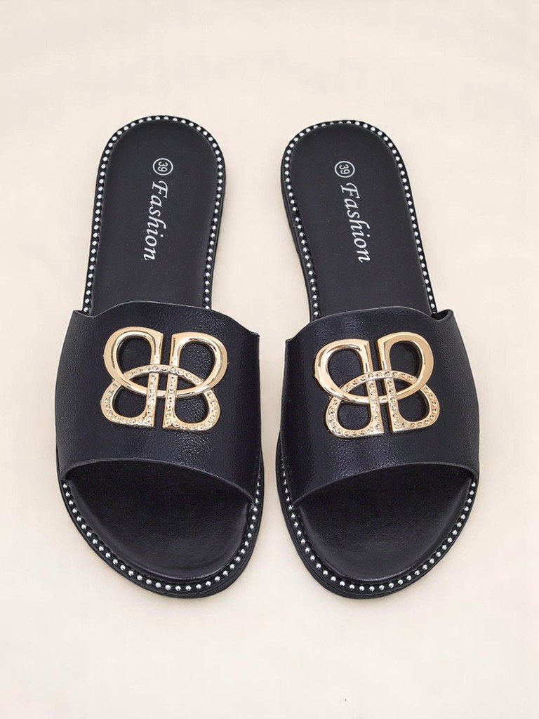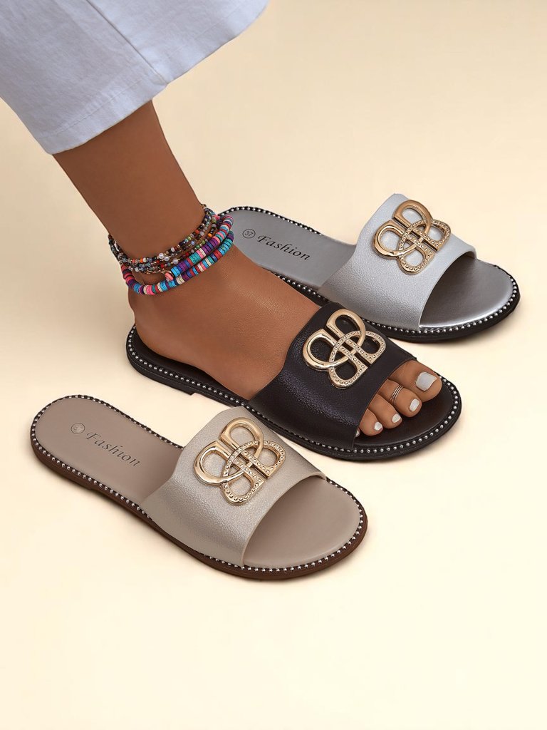 - Stilski natikači iz eko usnja na ravnem podplatu, okrašeni z zlatim okrasjem. Udobje in eleganca za vsak dan, ki bosta dodala sijaj vsaki poletni stilizaciji.