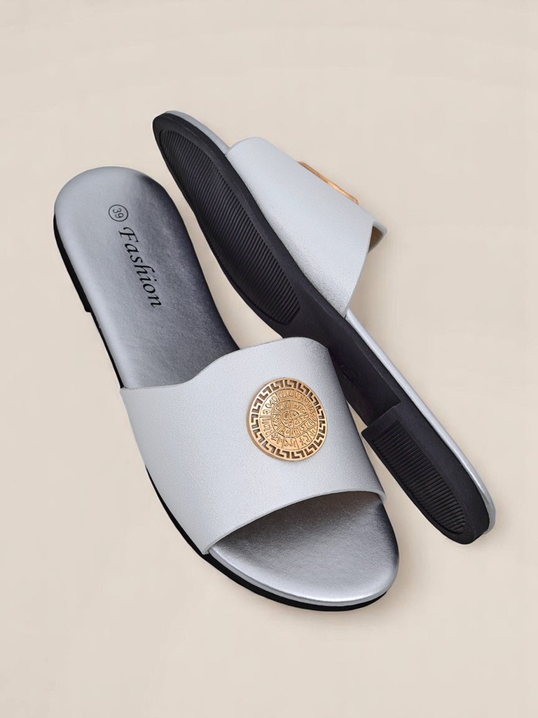 - Eleganti ženski natikači iz eko usnja z ravnim podplatom, okrašeni z zlatim okrasjem. Udobje in razkošje v enem – idealni za poletne dni in elegantne izhode.