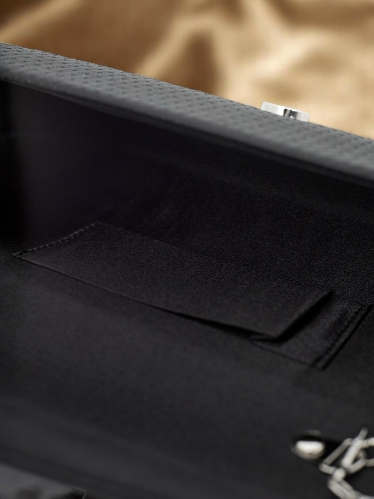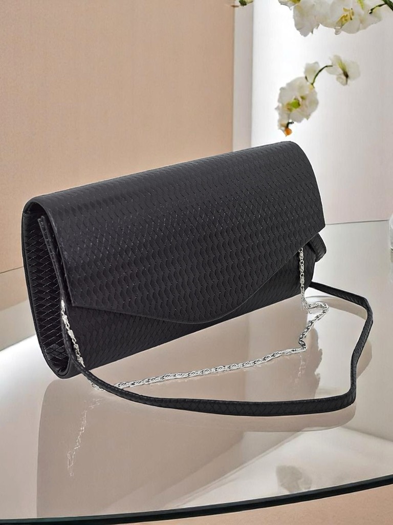 - Listová kabelka vyrobená z eko-kože, potiahnutá látkou so trblietavou niťou a jemným reliéfom. Zapínanie na magnet, s odnímateľným ramienkom – elegancia v lesklom prevedení.
