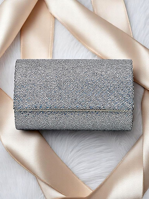 - Štýlová listová kabelka vyrobená z eko kože, potiahnutá hrubou trblietavou látkou. Zapínanie na magnet, s odnímateľným popruhom – ideálna na večerné výlety a špeciálne príležitosti.