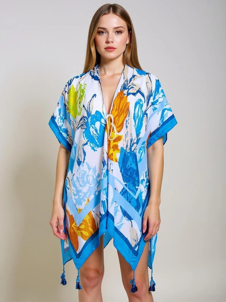 • Poletna tunika za na plažo tipa pareo z V-izrezom in asimetričnim spodnjim robom je eleganten "must-have" za počitnice. Zračna, lahka tkanina in učinkovit vzorec poudarjata ženstvenost, ohlapen kroj pa zagotavlja udobje v vročih dneh. Idealna za na plažo