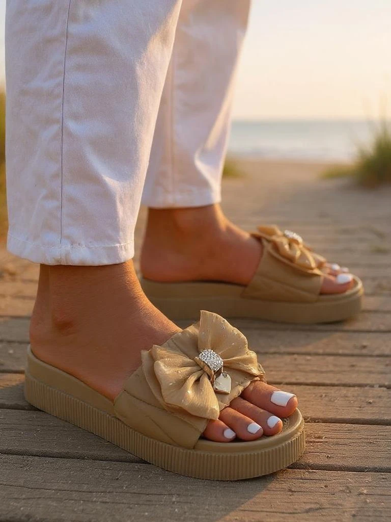 - Ženski natikači na lahki gumijasti platformi, idealni za poletne dni. Trak iz eko usnja, okrašen s prikupno pentljo, doda dekliški čar. Udobni, elegantni in ženstveni – odlična izbira za vsakodnevne izhode in sproščene počitnice.