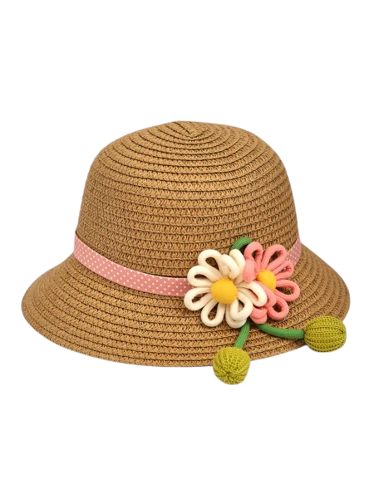 - Pôvabný dievčenský klobúčik vyrobený z prírodnej slamy, zdobený nášivkami v tvare kvetov. Ľahký a priedušný, ideálny na jarné a letné dni. Dodáva šarm, čím je perfektným doplnkom na pláž alebo prechádzku.