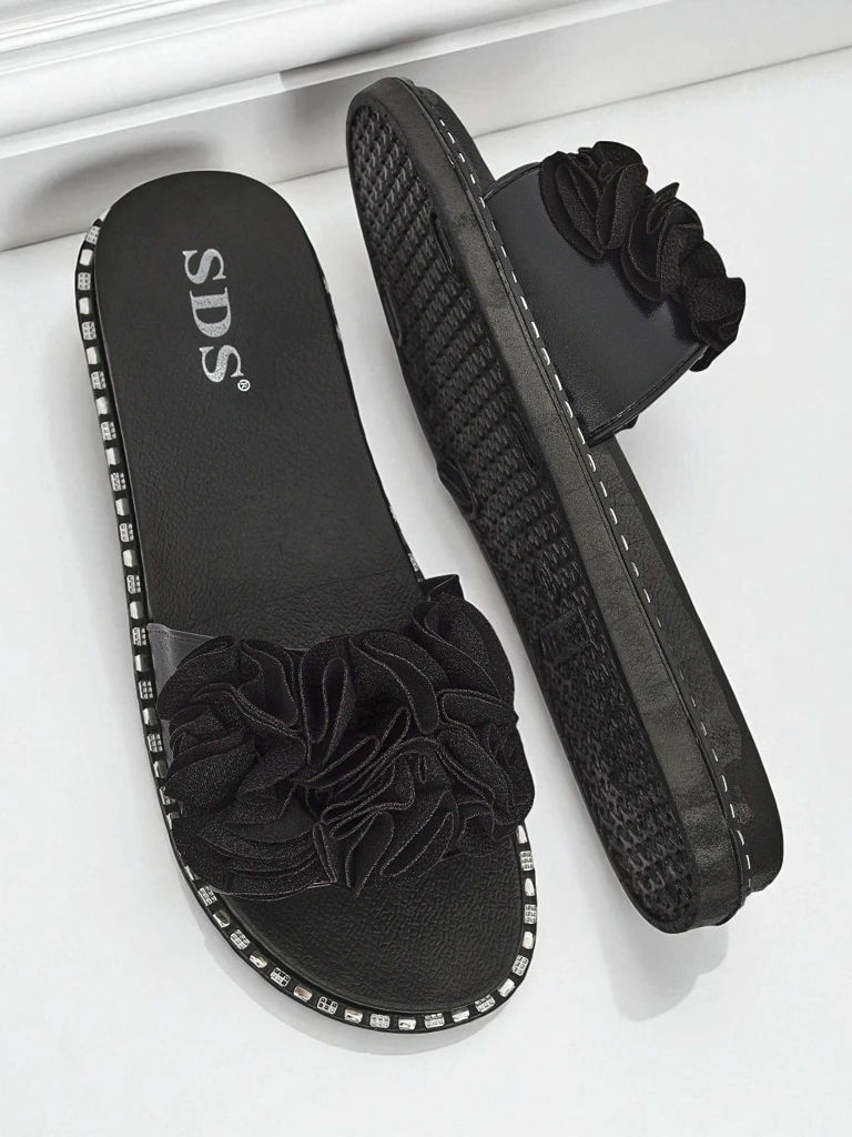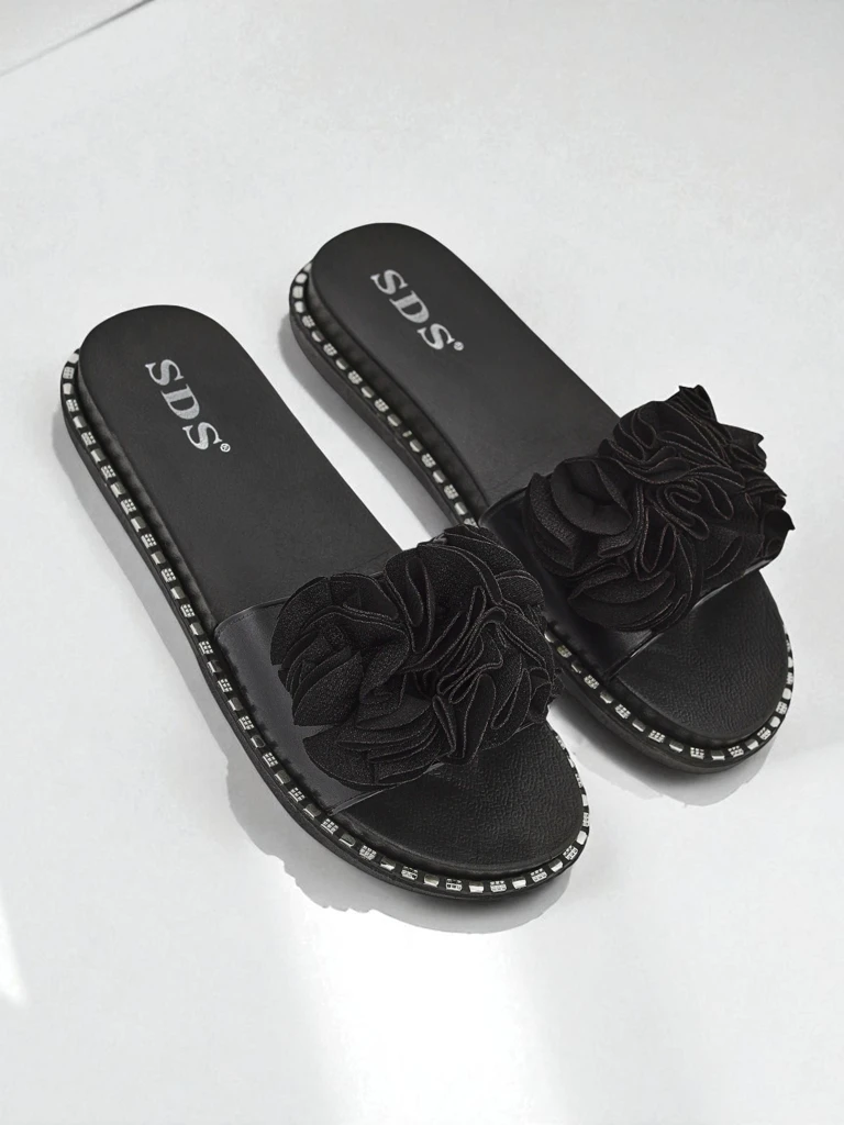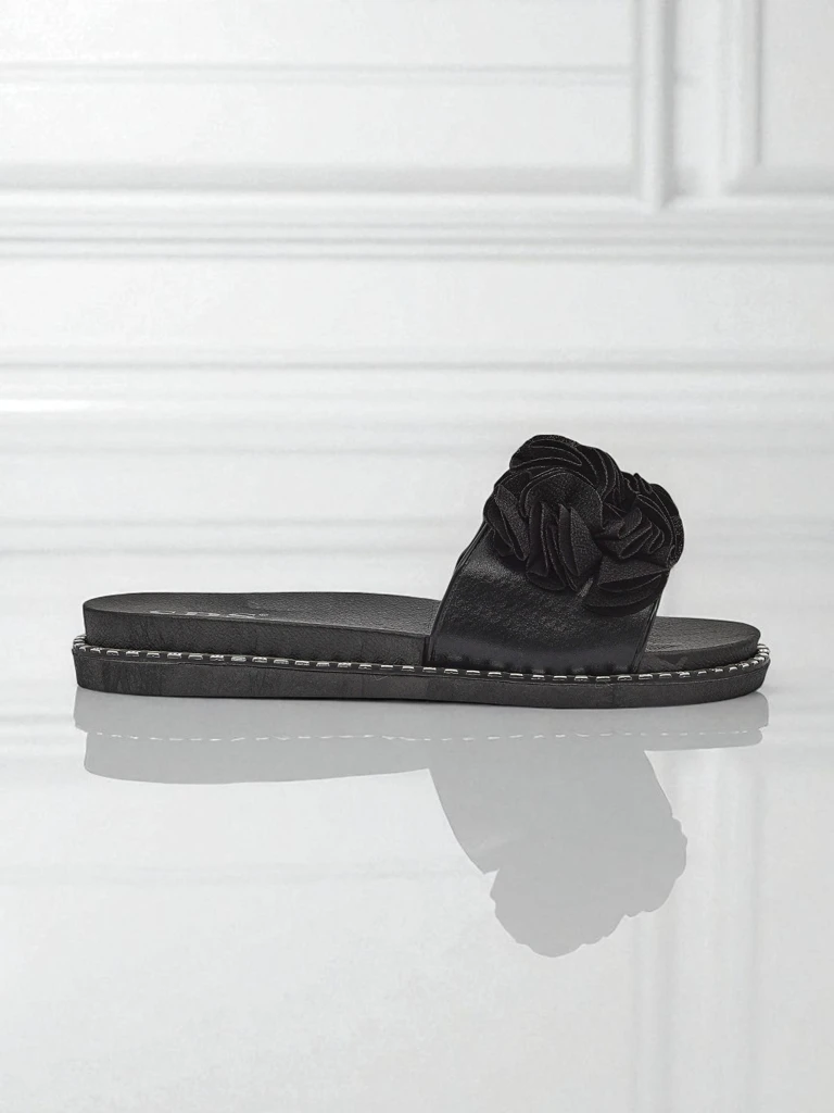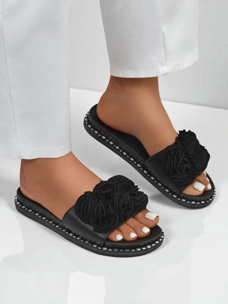 • Dámske papuče vyrobené z ekologickej kože, s módnym kvetinovým doplnkom. Ľahká, pohodlná a štýlová voľba na leto – ekologická elegancia na každý deň!