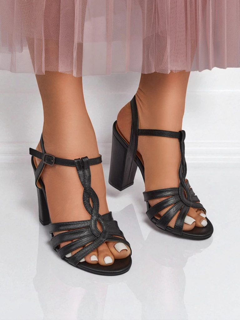 - Dámske sandále na vysokom bloku vyrobené z ekologickej kože, s dekoratívnymi pletenými remienkami a zapínaním na pracku. Štýlové a pohodlné – ideálne na letné výlety, večierky a elegantné príležitosti.