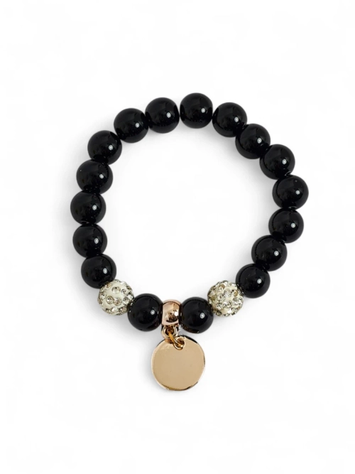 • Stilska zapestnica na elastičnem traku, okrašena z biseri, cirkoni in okroglim obeskom. Kombinacija sijaja in lahkotnosti – idealna za nošenje samostojno ali v kompletu.