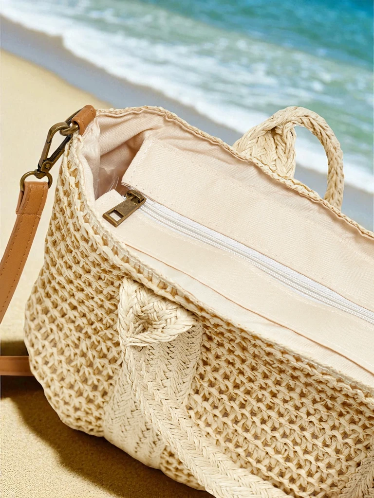 - Štýlová slamená taška s jedným priečinkom a vreckom, zapínaná na zips. Ľahká a priestranná, ideálna na letné dni. Perfektná k ležérnym outfitom, poskytuje pohodlie a organizáciu pri zachovaní módneho, dovolenkového šarmu. Skvelá na pláž aj prechádzky mest