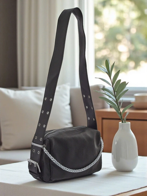 • Malá dámska kabelka z ekokože s jedným priehradkovým priestorom na zips. Štýlový široký popruh zabezpečuje pohodlné nosenie a ozdobná retiazka dodáva eleganciu. Ideálna na každodenné používanie aj večerné vychádzky – ľahká, praktická a pôsobivá.