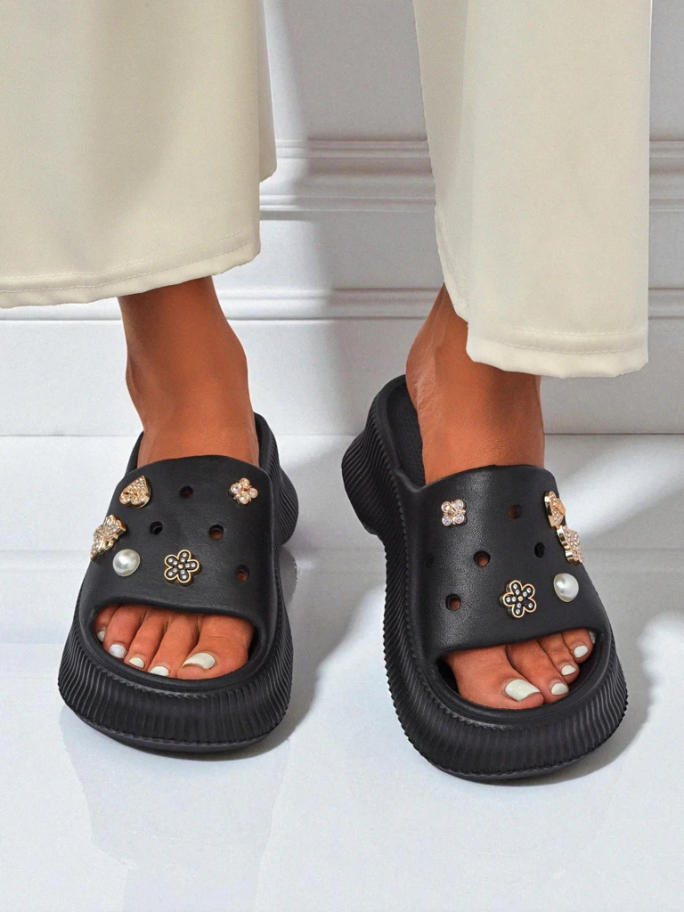 - Štýlové dámske šľapky so zdobením na hrubšej gumenej podrážke kombinujú pohodlie s módnym vzhľadom. Ideálne na leto — ľahké, odolné a vďaka detailom neprehliadnuteľné. Skvelé na pláž, do mesta aj na každodenné nosenie.