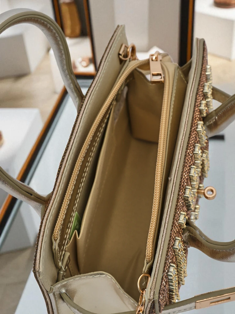 • Elegantna torbica z bleščečimi cirkoni, 1 predal, zapiranje na zadrgo. Elegantni ročaji in okrasna verižica dodajo eleganco. Idealna za posebne priložnosti – blestite s stilom!