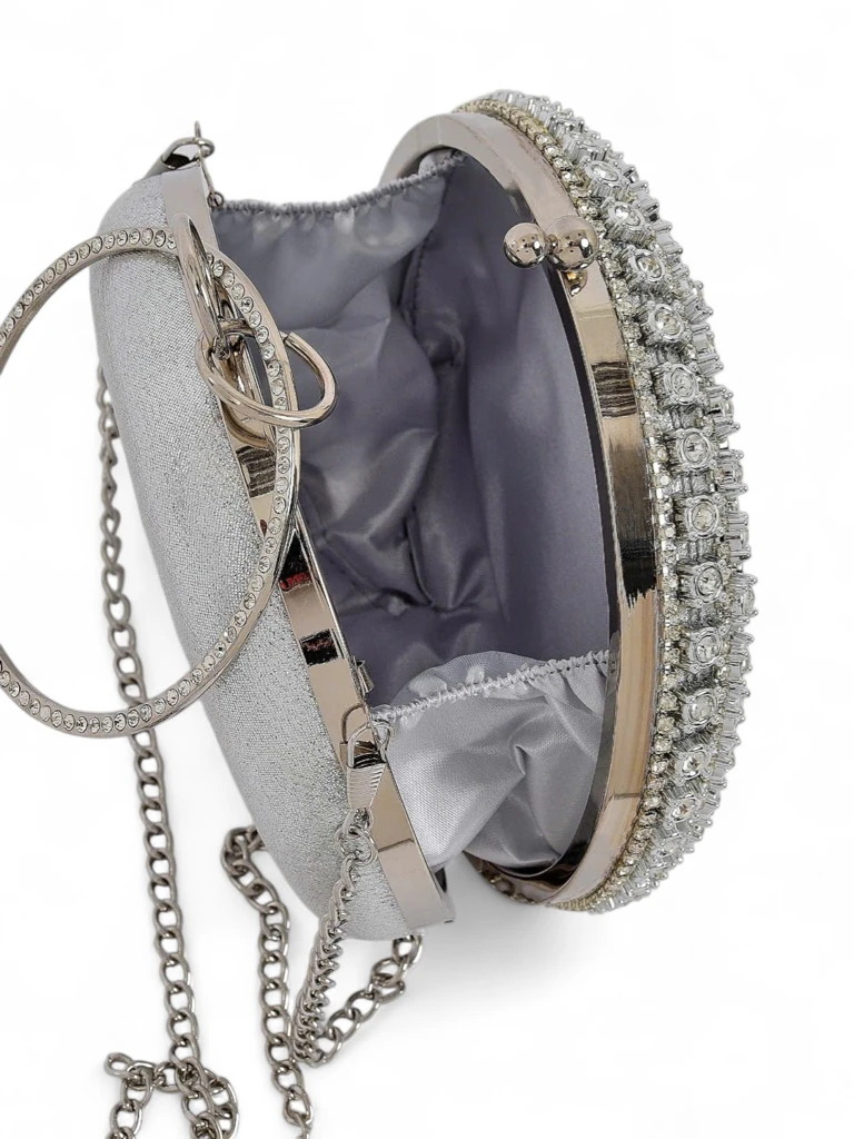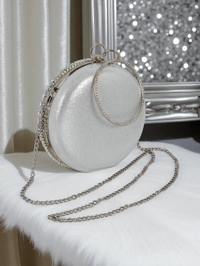 - Okrogla večerna torbica z zapleteno okrašeno površino s cirkoni. Verižica omogoča nošenje na rami. Elegantna, izrazita in ustvarjena, da se sveti po mraku.
