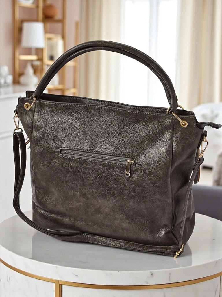 Torba Artemida Vera je vsestranska izbira za moderne ženske, ki iščejo kombinacijo elegance, funkcionalnosti in skrbi za okolje. Izdelana je iz visokokakovostnega eko usnja z gladko teksturo, prijetno na dotik. Ta material je zelo trpežen, odporen na mehanske poškodbe in enostaven za čiščenje, zaradi česar je torba izjemno praktična za vsak dan. Eko usnje, uporabljeno za proizvodnjo, je prestalo teste kakovosti in izpolnjuje visoke ekološke standarde, kar podpira ozaveščene nakupovalne odločitve. Notranjost torbe je skrbno zasnovana – našli boste prostoren glavni predal, ločene žepe za drobnarije in varen žep z zadrgo, ki ščiti najdragocenejše predmete. S širino 45 cm, višino 30 cm in globino 10 cm lahko ta model zlahka sprejme prenosnik, dokumente ali kozmetično torbico. Prednosti torbe Artemida Vera: - Sodoben, minimalističen dizajn v modni sivi barvi. - Udobni ročaji in odstranljiv naramni pas omogočajo nošenje na dva načina. - Zadrga zagotavlja varnost vsebine. - Skrbno dodelane podrobnosti in okrasne rese ji dodajo lahkotnost in ženstven stil. Kako kombinirati? 1. Poslovni stil: kombinirajte Artemida Vera z belo srajco, hlačami s kostimom in petami – odlična rešitev za pisarno. 2. Casual za mesto: kombinirajte z jeansom mom fit, ohlapnim puloverjem in supergami, in vaša stilizacija bo dobila urbani značaj. 3. Za posebne priložnosti: torba lepo dopolni klasično malo črno obleko ali pastelno obleko in elegantne balerinke. Nega in čiščenje: Da bi ohranili odličen videz torbe, jo čistite z mehko, vlažno krpo in jo shranjujte v suhem prostoru, stran od neposredne sončne svetlobe. Priporočljivo je tudi uporabljati poseben pripravek za nego eko usnja. Trendi sezone: Sivina in minimalistične oblike so absolutni must-have najnovejših kolekcij. Torba Artemida Vera se ujema s trendom eko in ozaveščene mode – z njo boste zlahka ustvarili brezčasne, modne stilizacije.