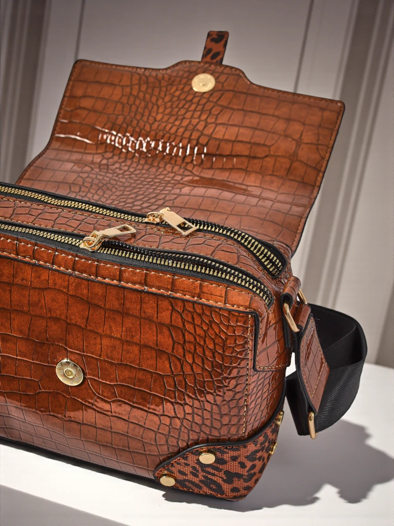 - Stilska torbica iz lakiranega eko usnja z reliefom in panterjevimi vstavki. 2 predelka za boljšo organizacijo in odstranljiv, nastavljiv pas. Drzna kombinacija elegance s pridihom divjega značaja.