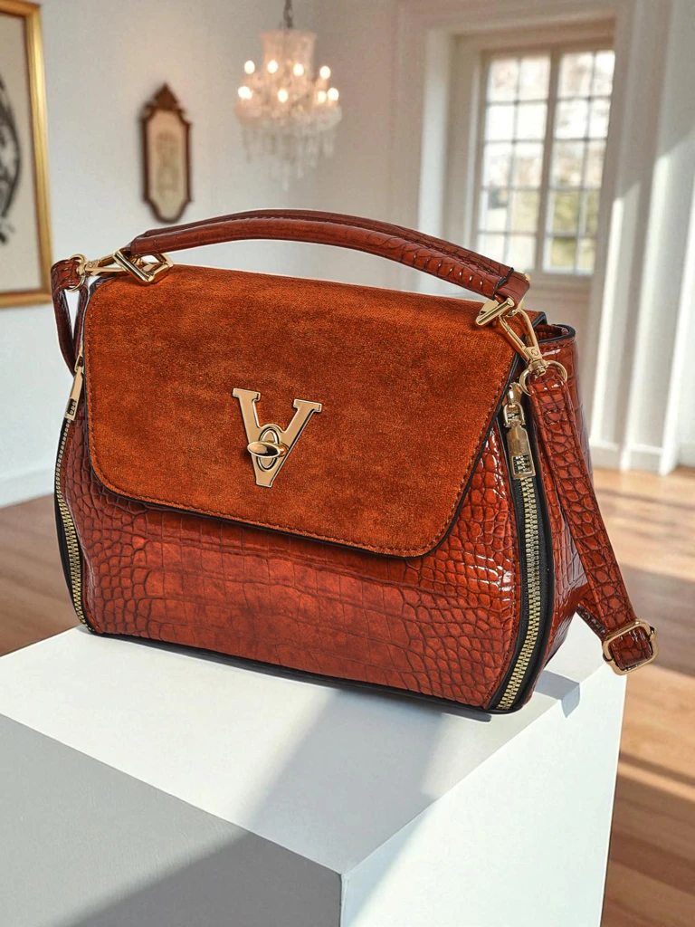 Ženska torbica Vespera Classico je kombinacija klasične elegance in modernih trendov. Izdelana je iz visokokakovostnega patentiranega ekološkega usnja z reliefno strukturo, ki posnema krokodiljo kožo, ter iz mehkega ekološkega semiš usnja, ki ji daje edinstven značaj. Celoten proizvodni proces temelji na ekoloških tehnologijah, ki zagotavljajo prijaznost do okolja brez izgube vzdržljivosti ali luksuznega videza. Črna barva s sijajem v kombinaciji z zlatimi detajli ter trdnimi zadrgami in magnetom poskrbi, da je ta model primeren tako za vsakdan kot za večerne izhode. Notranjost torbice je skrbno dodelana in zagotavlja praktično shranjevanje potrebnih pripomočkov – njena velikost (23 x 18 x 10 cm) je idealna izbira za ženske, ki cenijo priročnost in stil, še posebej, ker format A4 ne gre vanjo, kar poudarja njen kompakten značaj. Torbica tehta 690 g in ima ergonomski ramenski pas ter ročaj za nošenje v roki. - Eleganten videz, ki posnema krokodiljo kožo - Varovanje okolja z uporabo ekološkega usnja - Vzdržljivost materiala in udobje nošenja - Hiter dostop do notranjosti z magnetnim zapiranjem in zadrgo 1. Poslovni videz: Ujemite torbico s črnimi cigaretnimi hlačami, belo srajco in klasičnimi salonarji, da ustvarite eleganten komplet za v službo. 2. Sproščeno kosilo: Kombinirajte jo z jeans jakno, preprosto mini obleko in supergami za mestni šik. 3. Večerni izhod: Kombinirajte z lahkotno, črno obleko na preklop, zlatim nakitom in sandali s peto za romantično večerjo. Redno obrišite površino z vlažno, mehko krpo. Ne izpostavljajte je neposredni sončni svetlobi in vlagi, da ohranite obstojnost barve in strukture. Shranjujte jo v priloženi zaščitni vrečki, stran od ostrih predmetov, ki lahko poškodujejo material. Torbice iz reliefnega ekološkega usnja so 'must have' te sezone – vključujejo se v tok trajnostne mode in luksuznega minimalizma, idealno poudarjajo edinstven značaj vsake ženske.