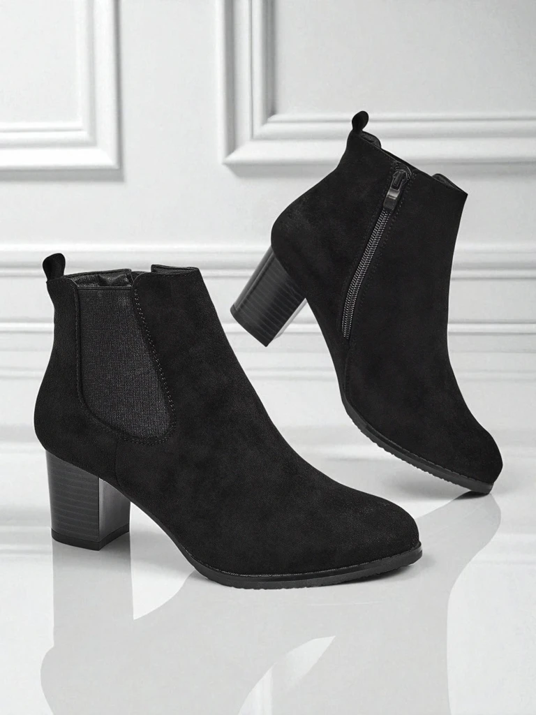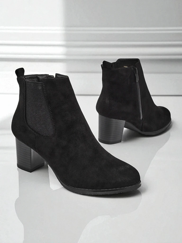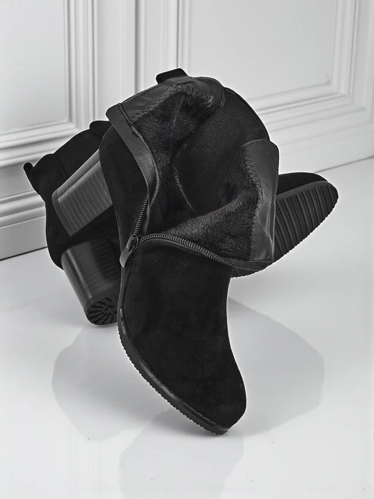 - Izjemni ženski gležnarji s peto so izdelani iz eko semiša. Notranjost je iz nežnega krzna. Model se zapenja z zadrgo. Imajo elastičen vstavek. Idealni za jesenske kombinacije!