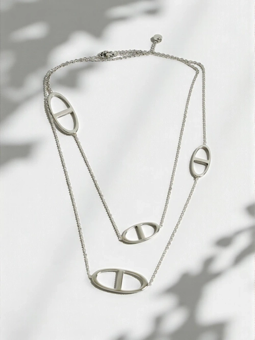 Srebrna ogrlica Athenia Dualis je kombinacija subtilne elegance in modernega stila. Izdelana je iz visokokakovostnega srebra čistine 925, ki zagotavlja trajnost in odpornost proti izgubi sijaja. Tehnologija obdelave tipa mirror-polish dodatno poudarja sijaj kovine, zaradi česar je ogrlica izjemno učinkovita tako v dnevni kot večerni svetlobi. Verižico krasijo stilizirani medaljoni geometrijskih oblik, ki jih navdihuje klasična grška umetnost in italijanska perfekcija dizajna. Vsi elementi so ročno brušeni in podvrženi kontroli kakovosti – to je nakit s hipoalergenim certifikatom, brez dodatka niklja. Athenia Dualis je odlična kot dodatek k vsakodnevnim stilom in za posebne priložnosti. Tukaj je nekaj predlogov za stiliziranje: 1. Mestni stil - to ogrlico nosite s preprosto majico svetle barve in ohlapnim suknjičem, da poudarite minimalističen značaj celote. 2. Eleganca za večer - kombinirajte ogrlico z malo črno obleko in visokimi petami; geometrijski medaljoni bodo izrazit poudarek vašega stila. 3. Romantična sproščenost - kombinirajte jo z lahko, zračno maksi obleko in poletnimi sandali – celota bo prekinila subtilnost obleke z nežnim sijajem srebra. Srebro čistine 925 je trajen material, vendar zahteva ustrezno nego: odstranite nakit pred kopanjem in spanjem, redno ga čistite s posebno krpo za srebro, ogrlico shranjujte v zaprti škatli, da preprečite matiranje. V primeru močnejše umazanije je priporočljivo uporabiti nežno raztopino vode z milom. Trenutni modni trendi močno stavijo na izrazit, a subtilen nakit geometrijske oblike. Minimalizem s pridihom brezčasne grške in italijanske klasike je viden tako na modnih pistah kot med vplivneži. Athenia Dualis bo poudarila vaš individualni stil in dodala značaj vsaki obleki.