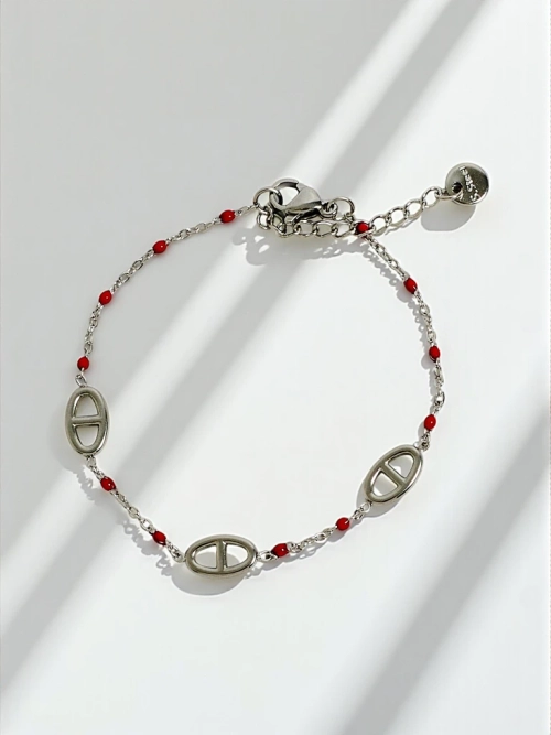 Zaradi nevtralne barve kovine in kontrastnih, močnih rdečih poudarkov se zapestnica ujema z različnimi stili. Ta dodatek je lahek, udoben za vsakodnevno nošenje in izjemno ženstven, saj vsakemu gibu zapestja doda prefinjenost.