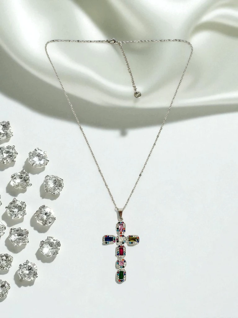Križna ogrlica Aurelia z barvnimi kristali srebrna