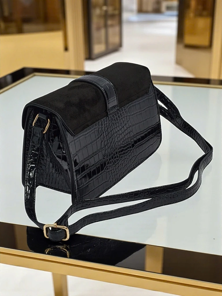 - Majhna torbica iz lakiranega eko usnja z elegantnim reliefnim vzorcem in vstavkom iz eko semiša. 1 predal, nastavljiv pas zagotavlja udobje in stil. Idealna za izhode – kompaktna oblika, ki pritegne pozornost.
