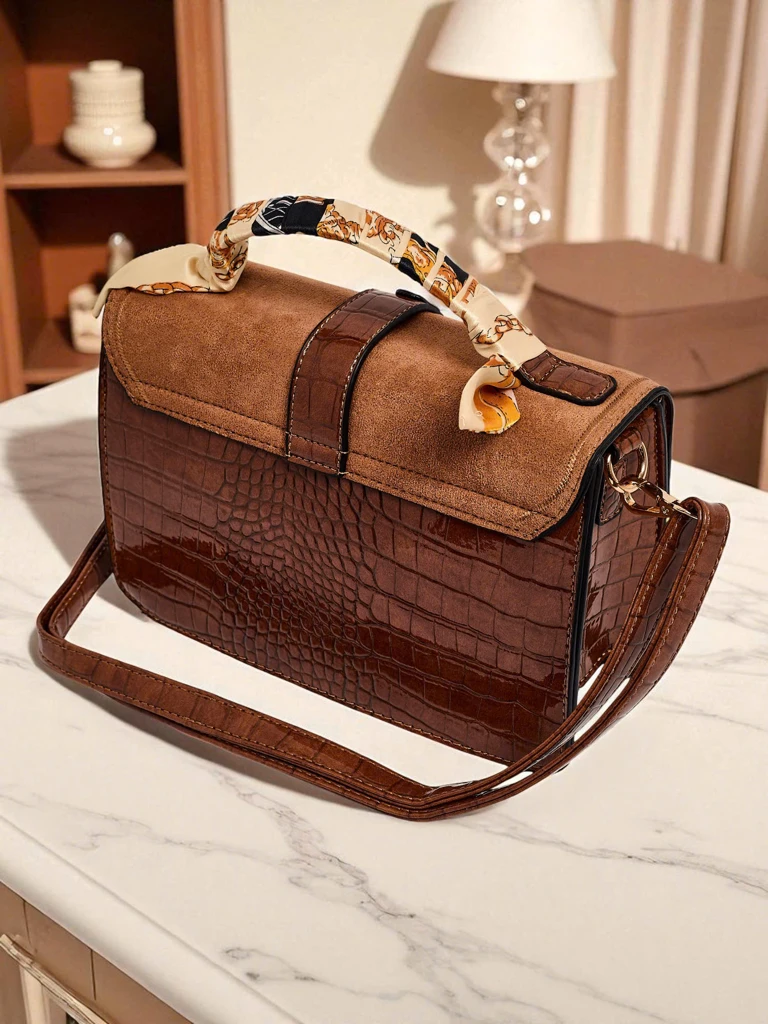 Materiali in tehnologija: Torbica je izdelana iz dveh vrst ekološkega usnja: semiš ekološko usnje (mikrovlakna s PU) na poklopcu in lakirano, ekološko patentno usnje (PU) z reliefom, ki posnema krokodiljo kožo na telesu. Patentna površina je nastala s tehniko reliefa in lakiranja, kar daje sijaj in strukturo »crocodile effect«. Notranjost je podložena s trpežnim poliestrskim materialom. Kovinski elementi v zlati barvi so rezkani in polirani, pas in ročaj pa sta skrbno šivana in strojno pritrjena, kar zagotavlja stabilnost konstrukcije. Izdelek tehta približno 512 g, dimenzije: 24 x 16 x 8 cm (š. x v. x g.). Uporaba in občutki: Poklopec iz mehke, semiš teksture daje torbici luksuzen, na dotik prijeten značaj, sijoče, reliefno telo pa dodaja eleganco in trpežnost. Majhna, kompaktna oblika omogoča ohranjanje reda – notranjost je razdeljena na dva predala, ločena s centralnim žepom na zadrgo in dodatnimi žepki za telefon in drobnarije. Uporaba zadrge plus magnetnega zapiranja zagotavlja dodatno varnost in hiter dostop. Stilski nasveti (mix-match): - Casual dnevni: kombinirajte s svetlimi kavbojkami, belo srajco in bež trenčkotom – torbica bo dodala topel poudarek in eleganco. - Pisarna / smart casual: kombinirajte s svinčnik krilom, srajco v kremnem odtenku in petami – idealna za dokumente in osnovne pripomočke. - Večer / srečanje: obleka v barvi steklenice zelene ali mornarsko modre in klasični črni gležnjarji – torbica bo ustvarila prefinjen kontrast. - Vikend / potovanje: lahke hlače, ohlapna srajca in superge – praktična in elegantna zahvaljujoč nastavljivemu pasu. Nega in shranjevanje: Semiš poklopec čistite z nežno krtačo za semiš; v primeru madežev uporabite namensko sredstvo za semiš (v skladu z navodili proizvajalca). Patentno površino obrišite z mehko, vlažno krpo, izogibajte se sredstvom s topili. Kovinsko okovje polirajte s suho krpo. Shranjujte v suhem, zračnem prostoru, najbolje v zaščitni vrečki/dustbag in z nadevom iz papirja, da ohranite obliko. Izogibajte se dolgotrajni izpostavljenosti sončni svetlobi, vlagi in visoki temperaturi. Servis in garancija: Informacije o garanciji in možnostih servisiranja so na voljo pri prodajalcu. Trendi: Minimalistične mini torbice, kombinacija tekstur (semiš + lak), nevtralne camel barve in motiv reliefa »crocodile« ostajajo v sezoni na vrhu – to je praktična izbira za ljudi, ki cenijo eleganco in univerzalnost. Dodaten poudarek v obliki rute na ročaju se ujema z modo personalizacije in plastenja dodatkov.