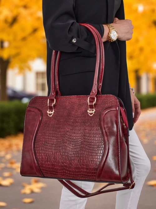 - Elegantna ženska ročna torbica iz eko usnja z reliefom – idealna za poslovne videze. Model ima 1 predal s pregrado in 4 žepe. Dodatno ima snemljiv, nastavljiv pas.
