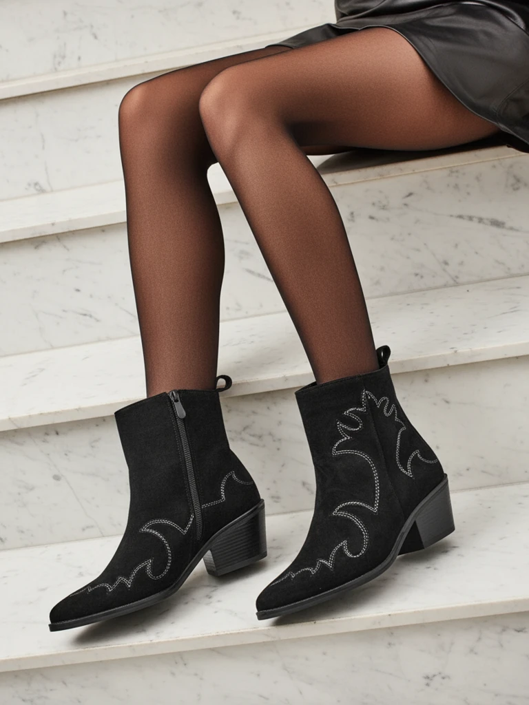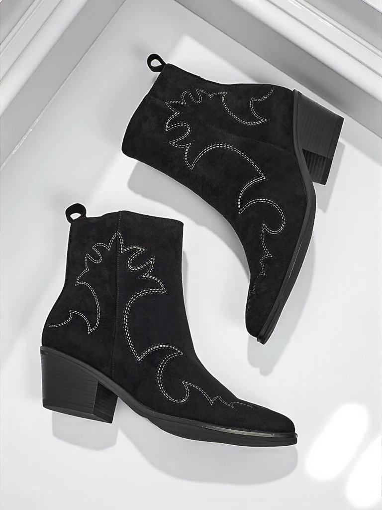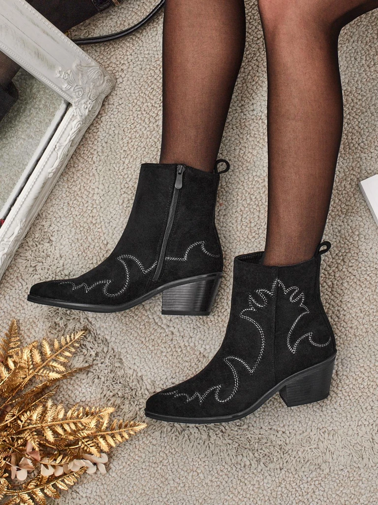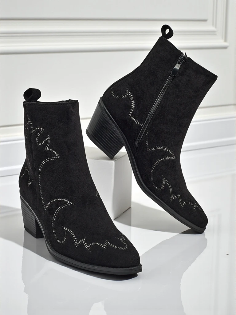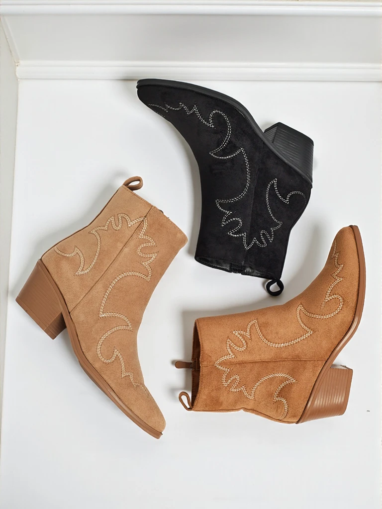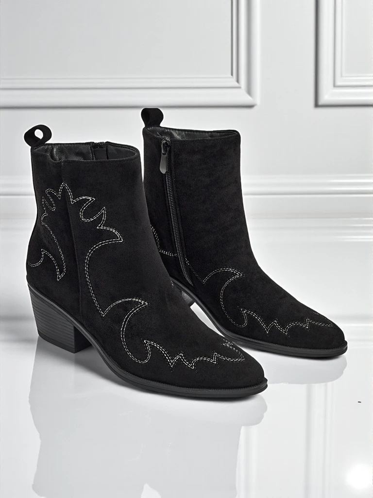 • Ženski gležnarji v stilu kavbojk Velvet Ash – s peto, izdelani iz eko semiša. Špičasta konica, zapiranje na zadrgo, brez podloge. Modna izbira za vsak letni čas – udobje in stil.