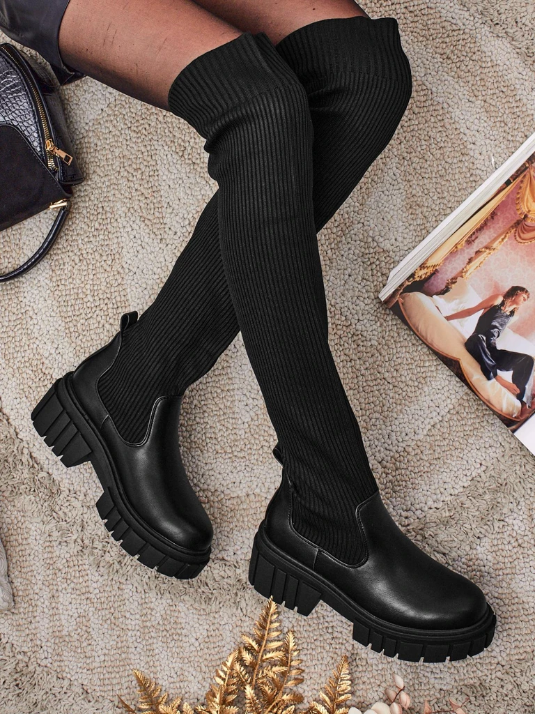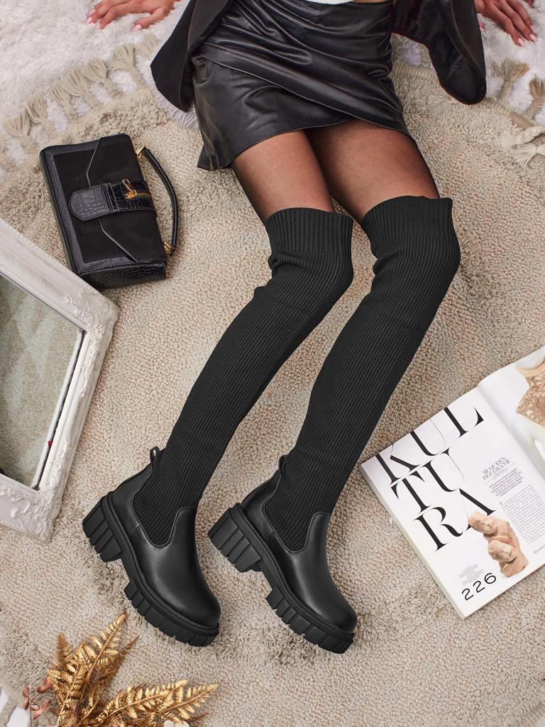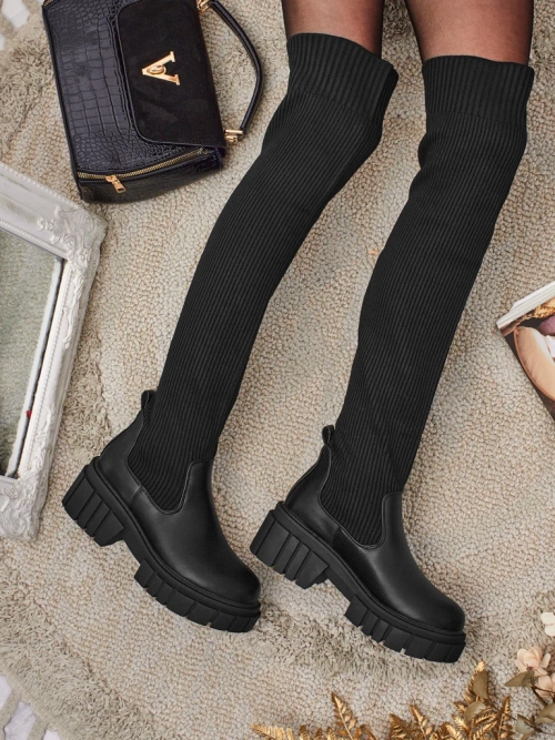 • Stilski ženski škornji čez koleno s plosko peto. Zgornji del je izdelan iz elastičnega tkaninskega materiala z vstavki iz eko usnja, znotraj je tekstilni vložek. Model je na natik. Idealni za vsakodnevne jesenske kombinacije!