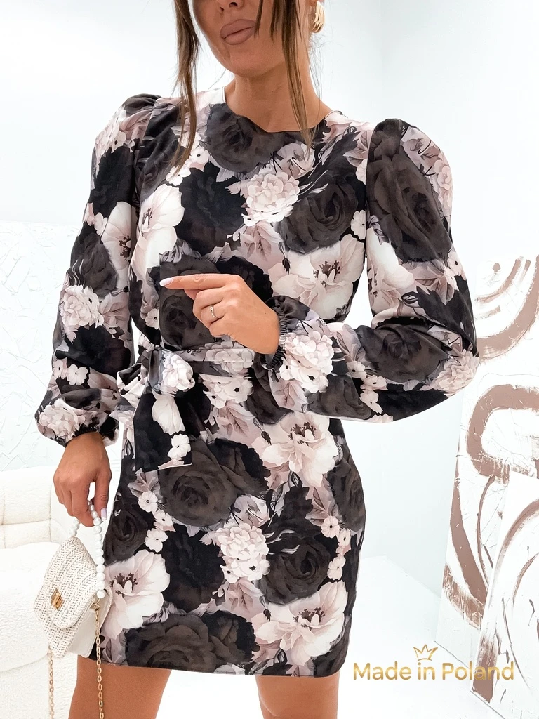 • Kratka, brezčasna ženska obleka je kombinacija moderne elegance in romantičnega stila. Napihnjeni dolgi rokavi dodajo obleki lahkotnost in izjemen videz. Nežno zavezovanje v pasu poudari pas in daje obleki subtilno obliko.