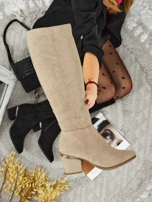 - Stilski ženski škornji do kolen s stebričasto peto. Zgornji del je izdelan iz eko semiša, notranjost pa je podložena s krznom. Model se zapenja z zadrgo. Idealni za vsakodnevne jesenske kombinacije!