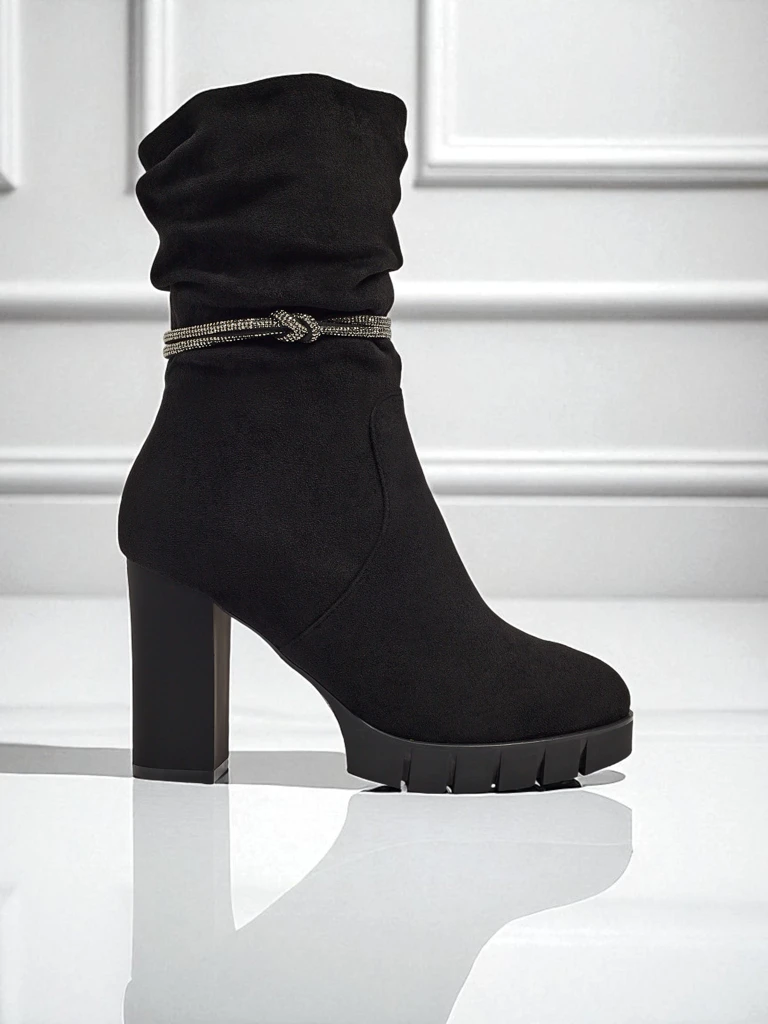 - Udobni gležnarji s peto, izdelani iz eko semiša. Model se zapenja z zadrgo. Ima okrasni pas s cirkoni. Podloženi z nežnim krznom.