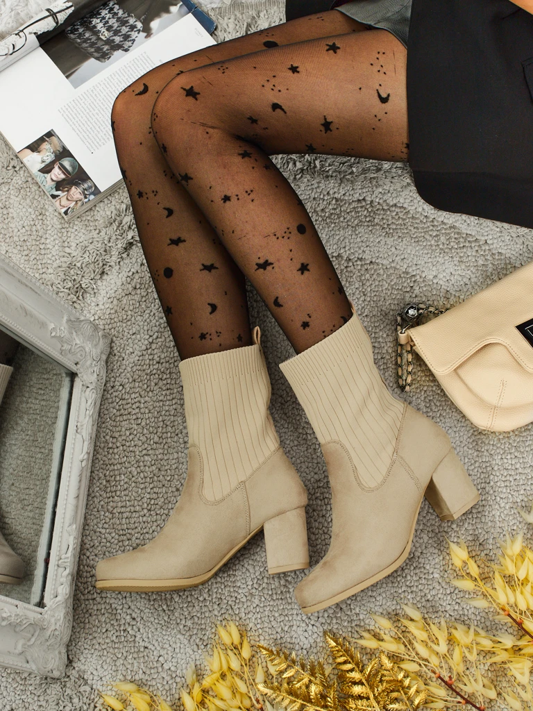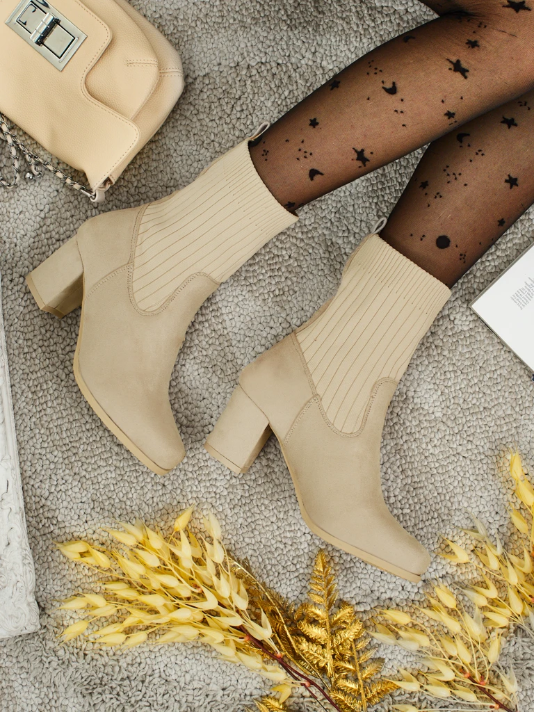 - Udobni gležnarji s peto, izdelani iz eko semiša. Model se natika z vstavkom, ki spominja na nogavico. Ima nežno podlogo v obliki krzna.