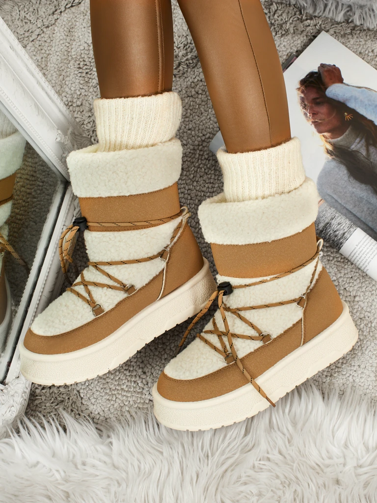 • Odlični ženski zimski škornji za sneg z debelejšim podplatom. Zgornji del je izdelan iz ekološkega nubuk usnja in materiala a'la ovčja koža, notranjost je izolirana s krznom. Idealna osnova za zimo!