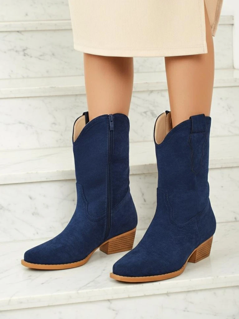 - Kavbojski škornji z nizko peto, izdelani iz ekološkega semiš usnja. Tekstilni vložek, čevlji se zapenjajo z zadrgo. Primerni za številne ženske stilske kombinacije!