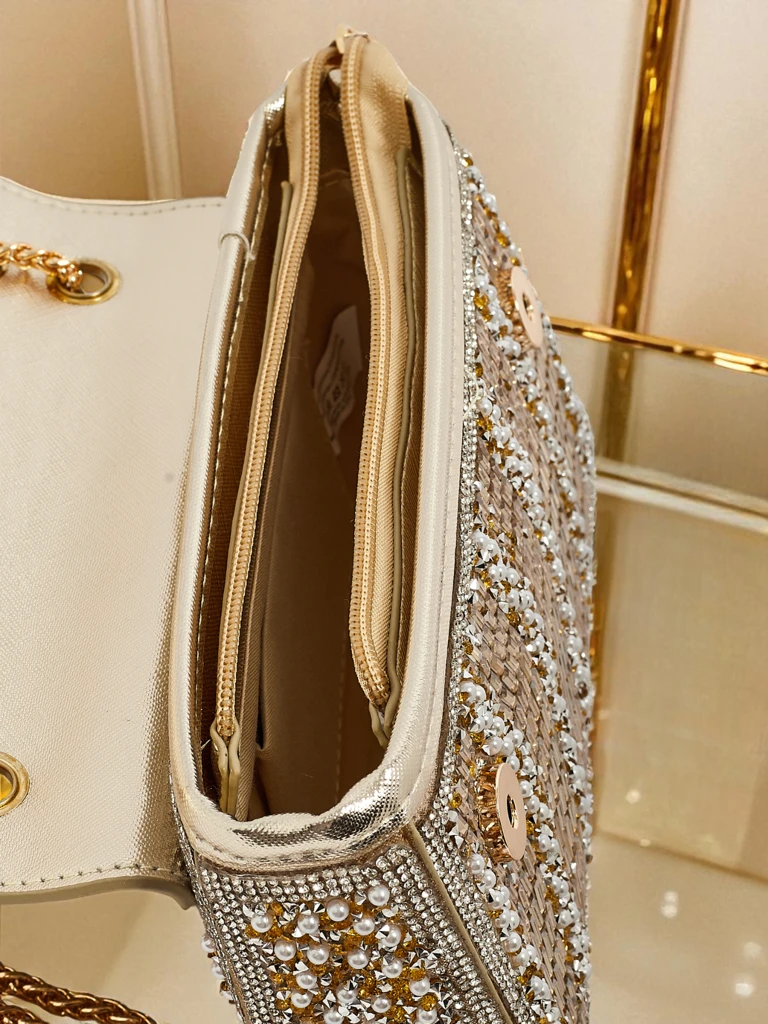 - Elegantna torbica z bleščečimi cirkoni, 1 predal, zapiranje na zadrgo. Elegantni ročaji in okrasna verižica dodajo eleganco. Idealna za posebne priložnosti – blestite s stilom!
