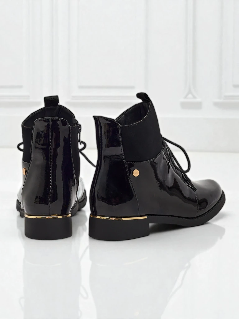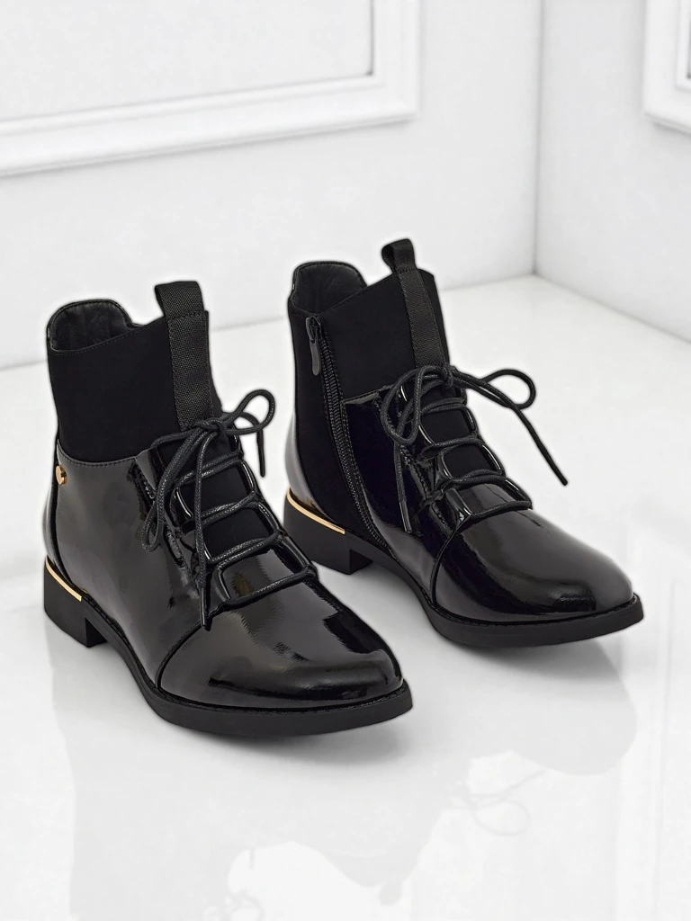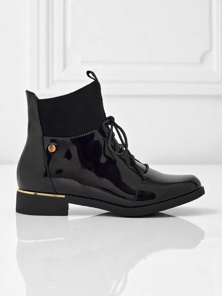 - Ženski gležnarji iz lakiranega eko usnja, z zadrgo in vezalkami ter okroglo konico - dodatno ogreti s krznom - modernost, udobje in stil v enem.