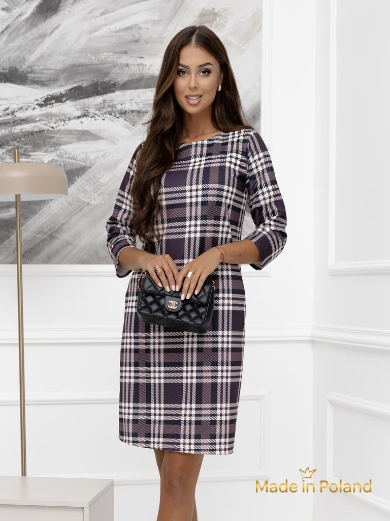 - Ženska mini obleka. Model s 3/4 rokavi in okroglim izrezom. Okrašena z vzorcem karo, ima žepe. Must have v vaši omari!