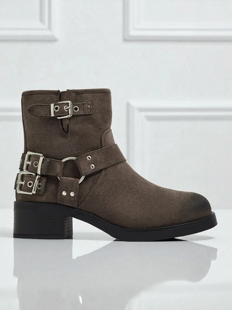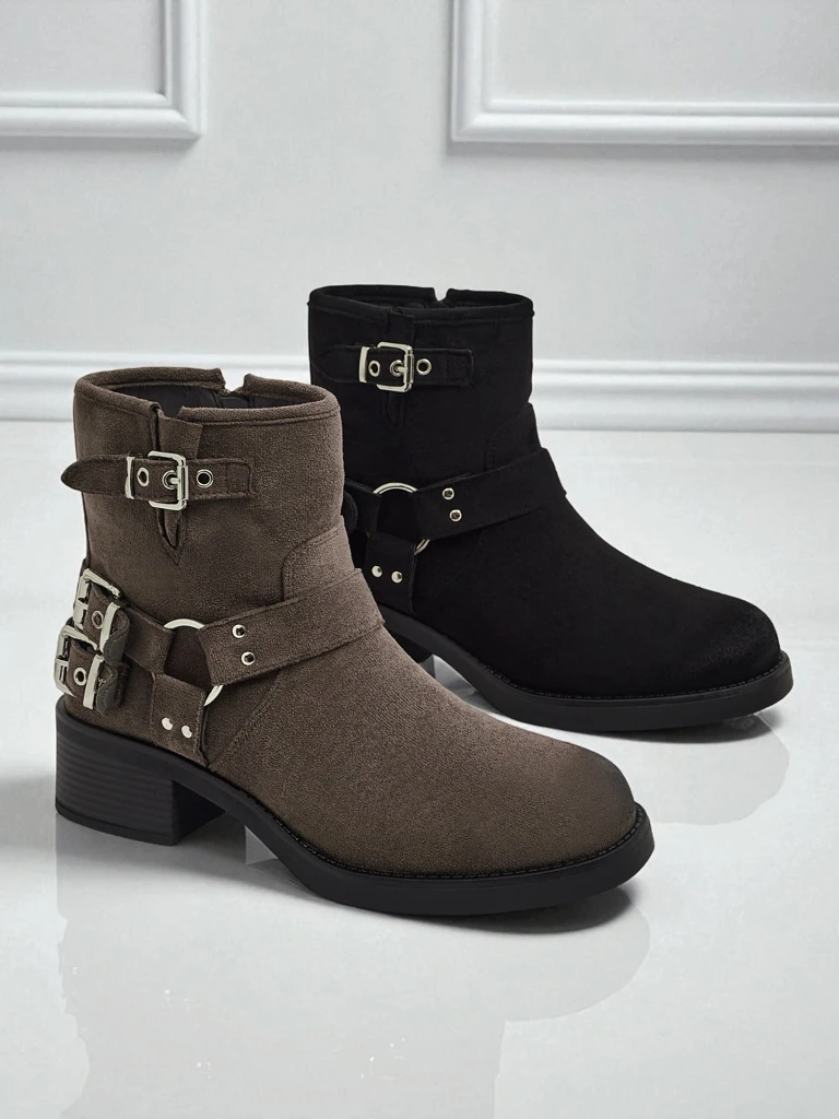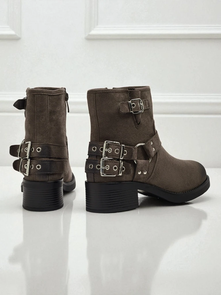 • Ženski gležnarji iz eko semiša s sponkami. Podloženi z nežnim krznom, se zapenjajo z zadrgo. Okrašeni s sponkami. Primerni za številne ženske stilske kombinacije!