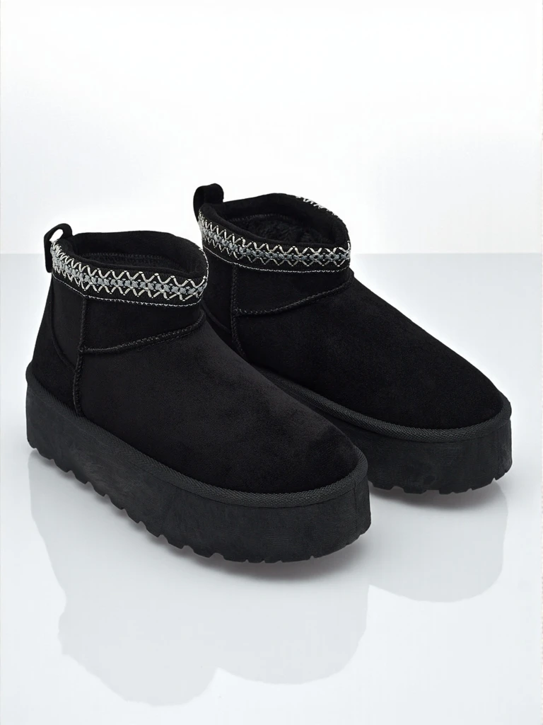 - Odlični ženski zimski škornji za sneg na debelejšem podplatu tipa platforma. Zgornji del je izdelan iz ekološkega semiš usnja, notranjost je izolirana s krznom. Idealna osnova za zimo!