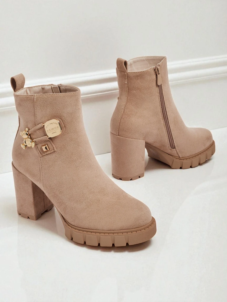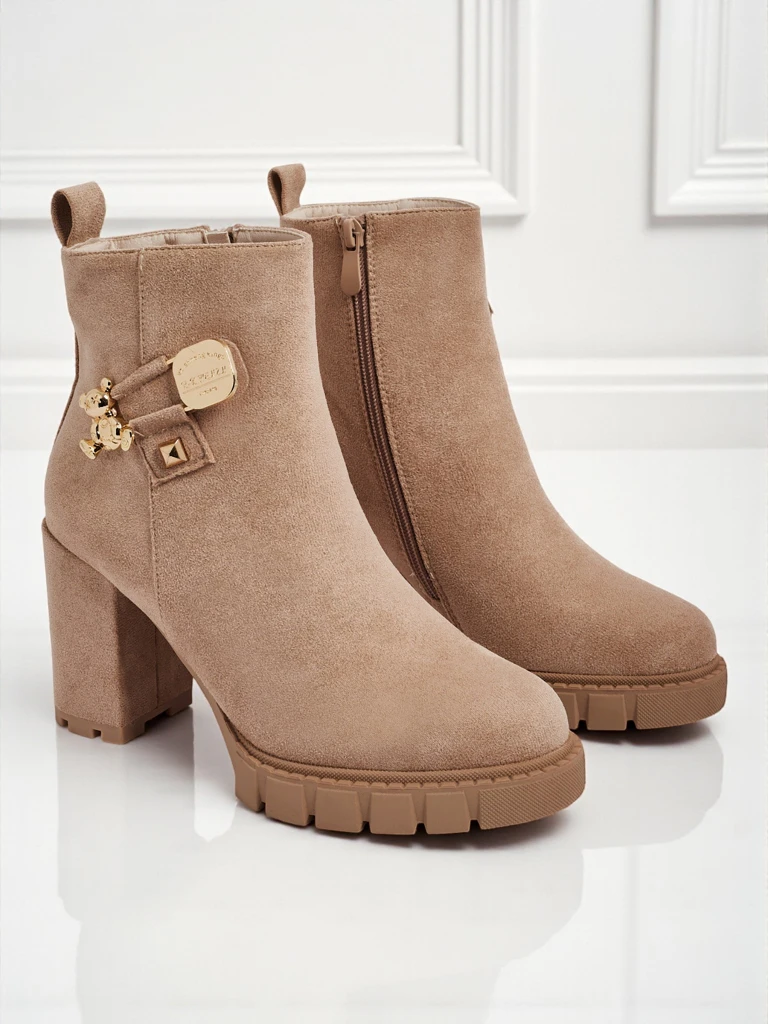 • Udobni gležnarji s peto, izdelani iz eko semiš usnja. Model se zapenja z zadrgo. Model je rahlo podložen s krznom in ima na strani zgornjega dela zlat okras. Idealna izbira za jesen!