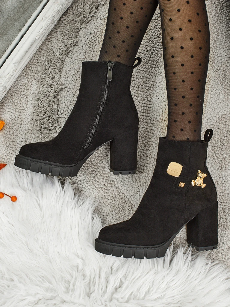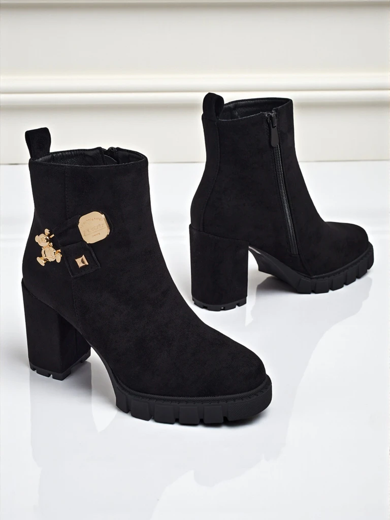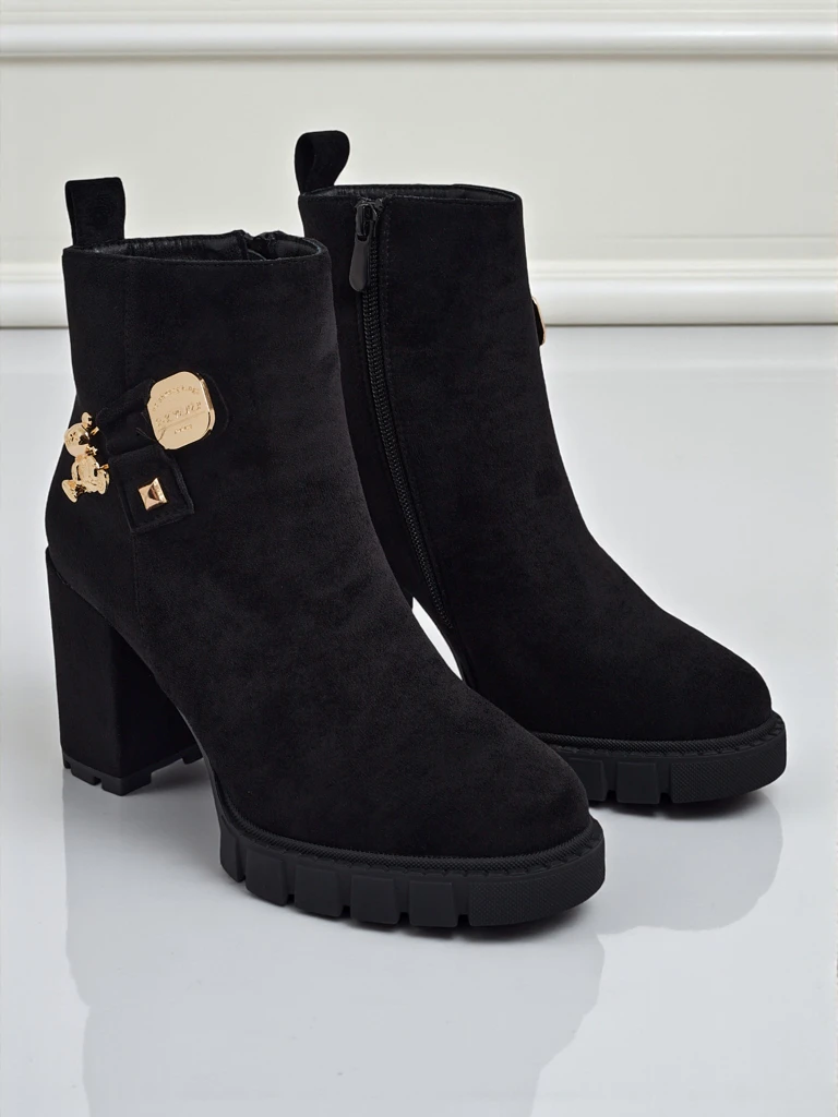 • Udobni gležnarji s peto, izdelani iz eko semiš usnja. Model se zapenja z zadrgo. Model je rahlo podložen s krznom in ima na strani zgornjega dela zlat okras. Idealna izbira za jesen!