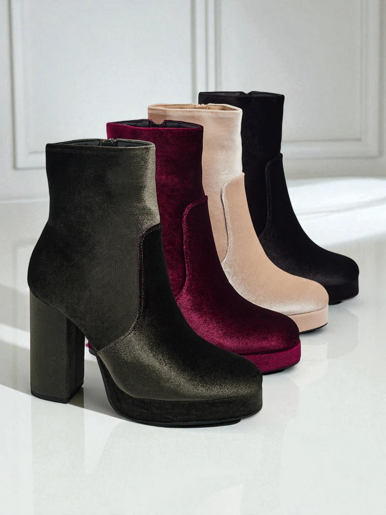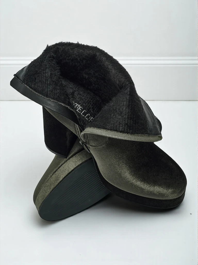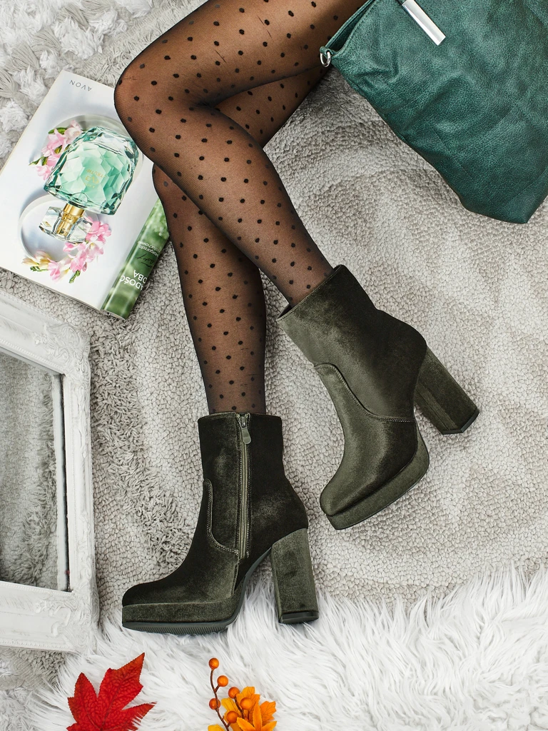 - Udobni gležnarji s peto, izdelani iz blaga, ki spominja na velur. Model se zapenja z zadrgo. Ima nežno podlogo v obliki krzna. Idealna izbira za jesen!