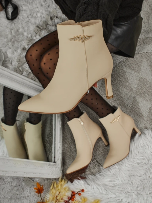 - Elegantni ženski gležnarji iz mat eko usnja so idealna rešitev za hladnejše dni. Model se zapenja z zadrgo in ima podlogo v obliki krzna. Model s peto in špičasto konico. Okrašen z elementom iz cirkonov.