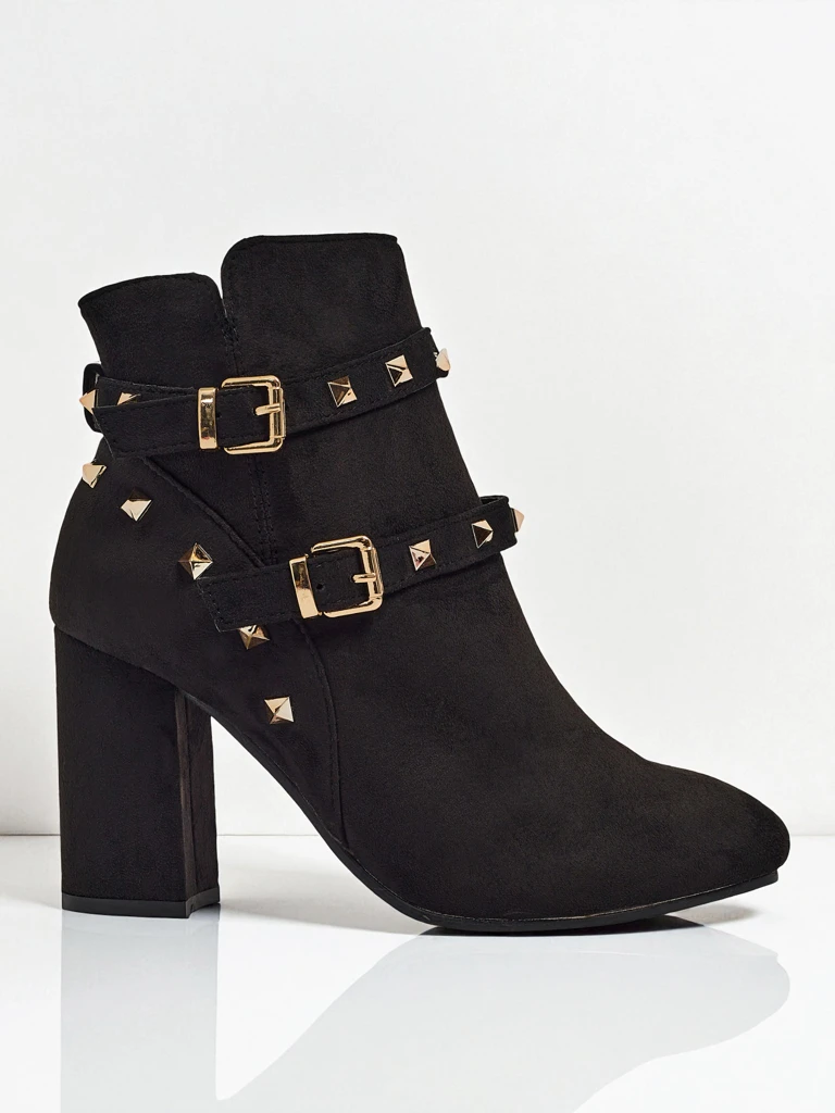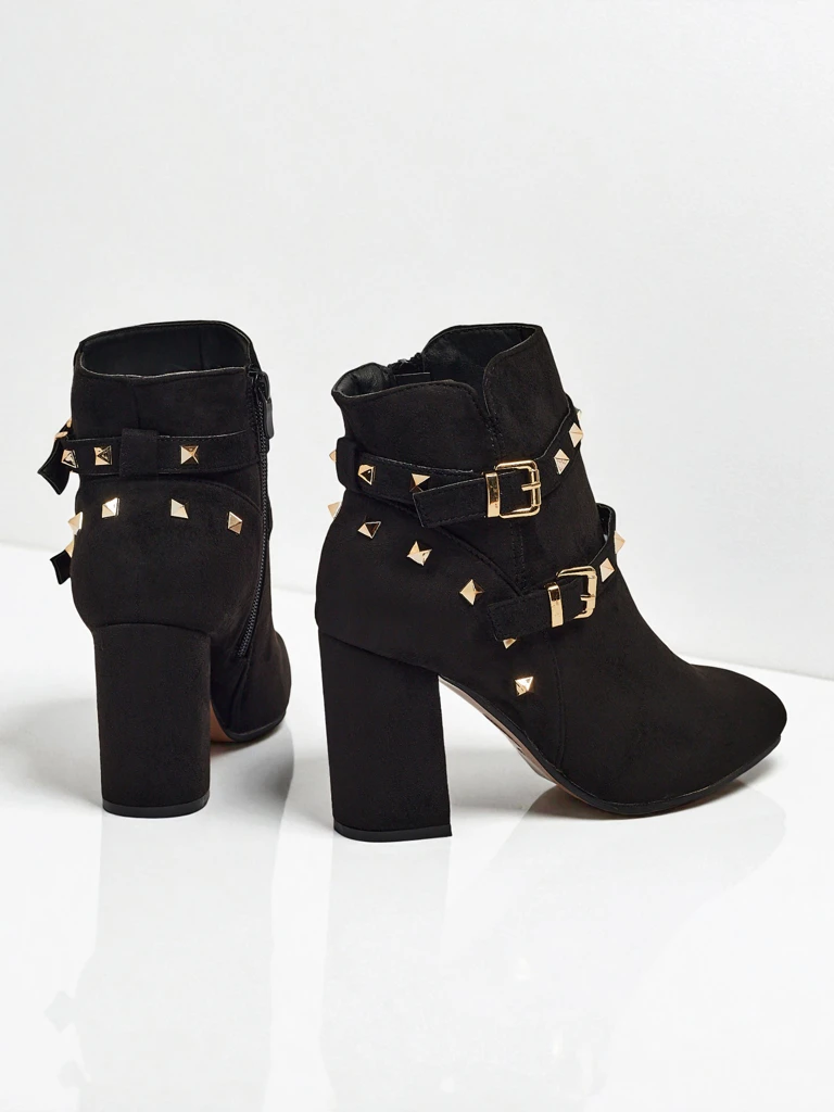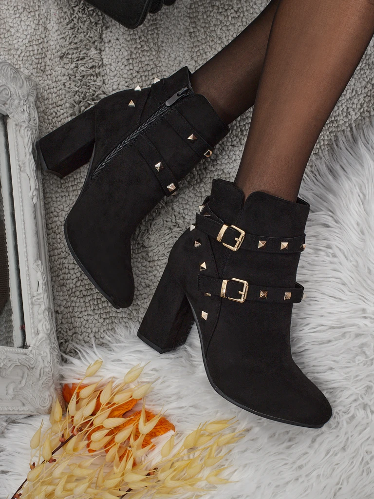 Charakterystycznym elementem są złote detale w postaci klamerek i ćwieków, które dodają botkom nieco punkowego charakteru. Słupkowy obcas o wysokości 9 cm zapewnia stabilność i wygodę podczas noszenia, a zamek błyskawiczny z tyłu ułatwia zakładanie i ściąganie.