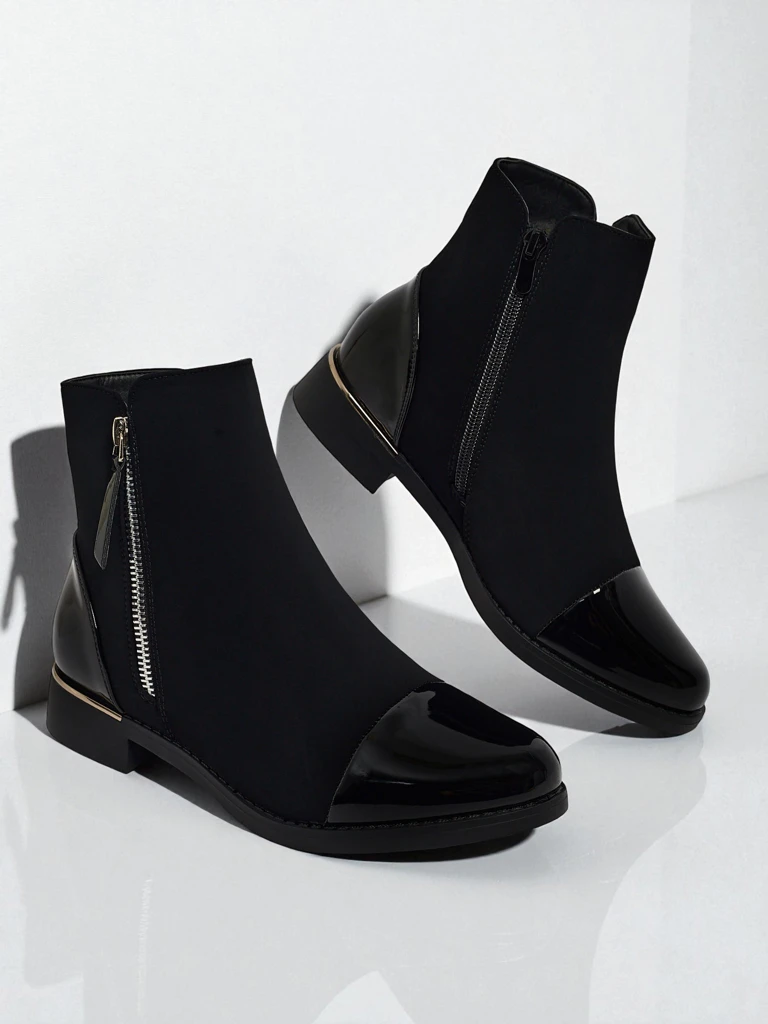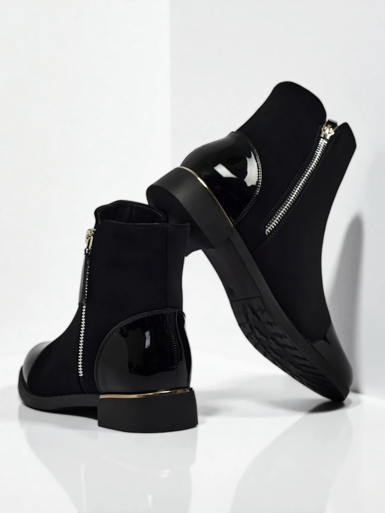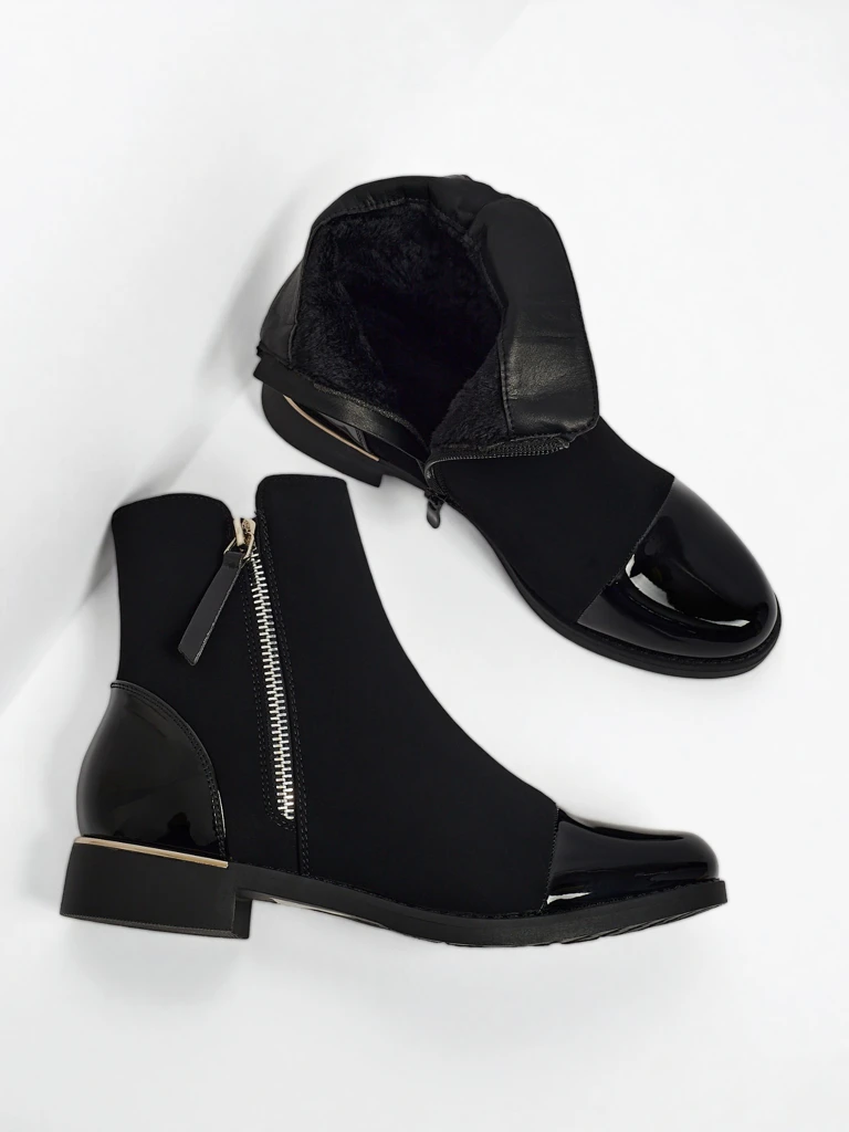 • Izjemni ženski gležnjarji z debelejšim podplatom so izdelani iz kombinacije lakiranega eko usnja in mat usnja. Notranjost iz nežnega krzna zagotavlja toploto v hladnejših dneh. Model se zapenja z zadrgo.